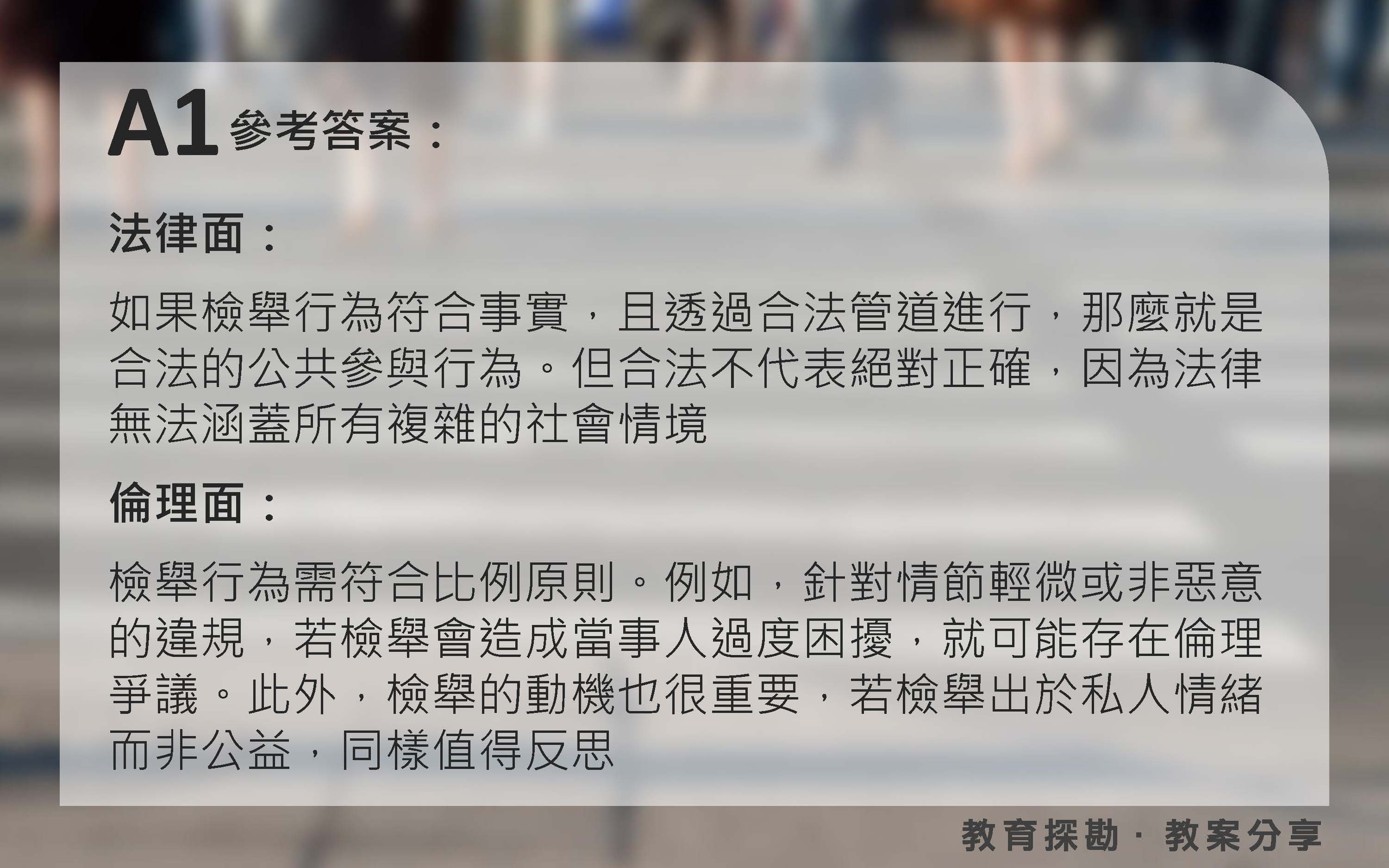 提供《創刊》No.5「教育探勘」專欄〈路上的眼睛─從「檢舉達人」到「正義魔人」的界線 〉之教案分享;「美妙人生」專欄〈低頭族出車禍,責任該算誰的?走路滑手機的危險 真相〉提問之參考答案。