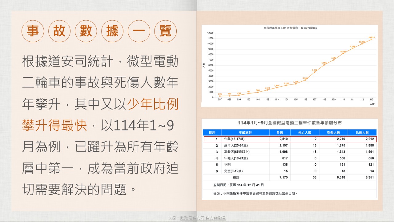 01 微型電動二輪是什麼?車種分類與使用規範02 真實事故案例與常見違規行為說明 03 微型電動二輪的安全風險與八大爭議 04 交通事故數據與少年族群問題分析 05 常見迷思破解與法律責任說明 06 國內外管理制度比較(日本、韓國、德國) 07 公共政策與制度設計討論 08 安全騎乘行為檢核與課程反思 |