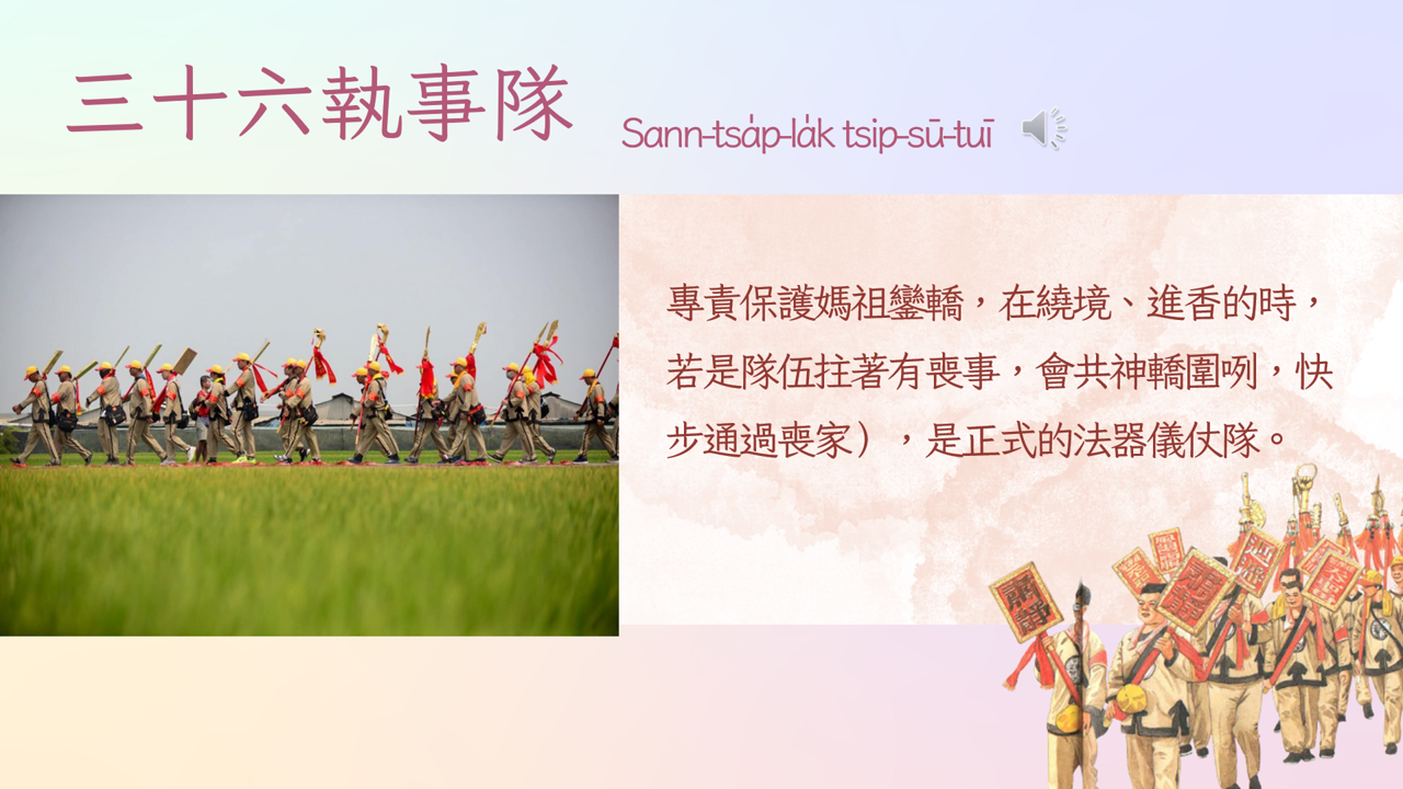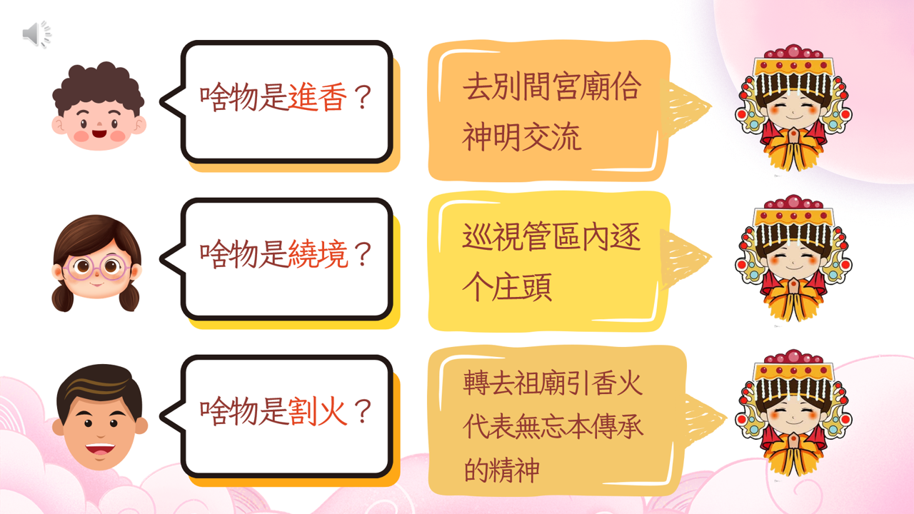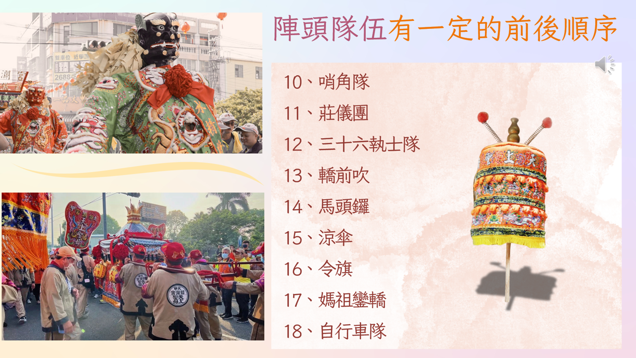 01 認識媽祖信仰起源及大甲媽祖歷史發展02 說明進香與繞境意義及完整儀式流程 03 分析陣頭隊伍、報馬仔等文化特色與社會功能 |