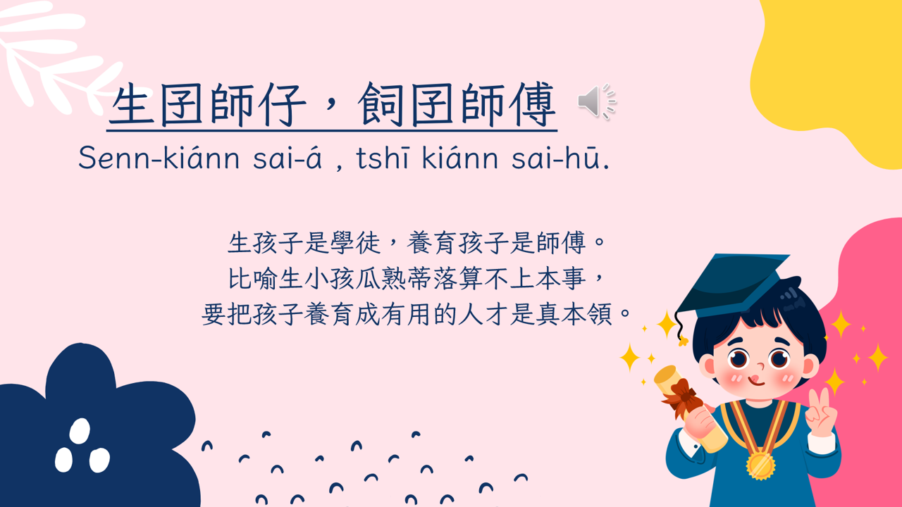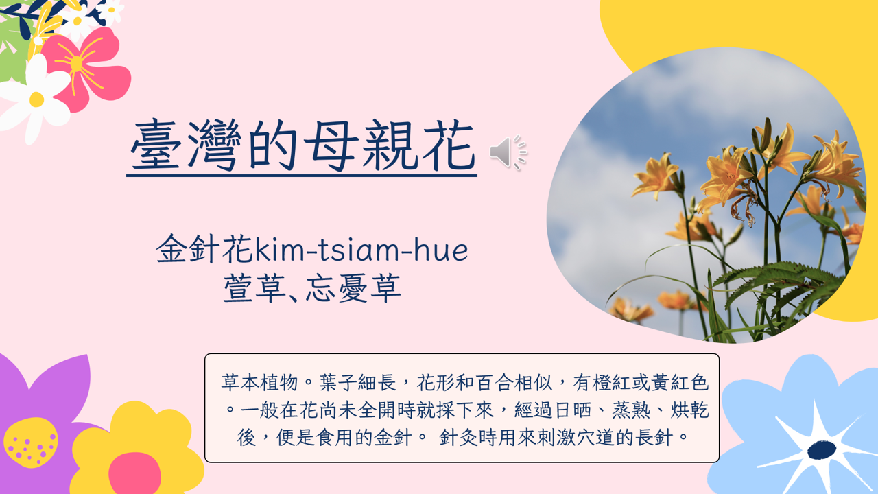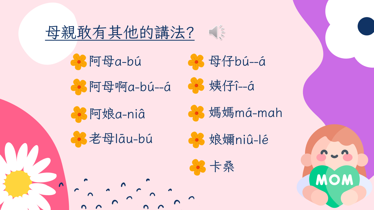 本課程以母親節為主題,結合臺語詞彙與文化背景,透過節慶由來與各地母親花介紹,引導學生認識語言與文化的連結,並培養對母親與家庭的感恩之情。