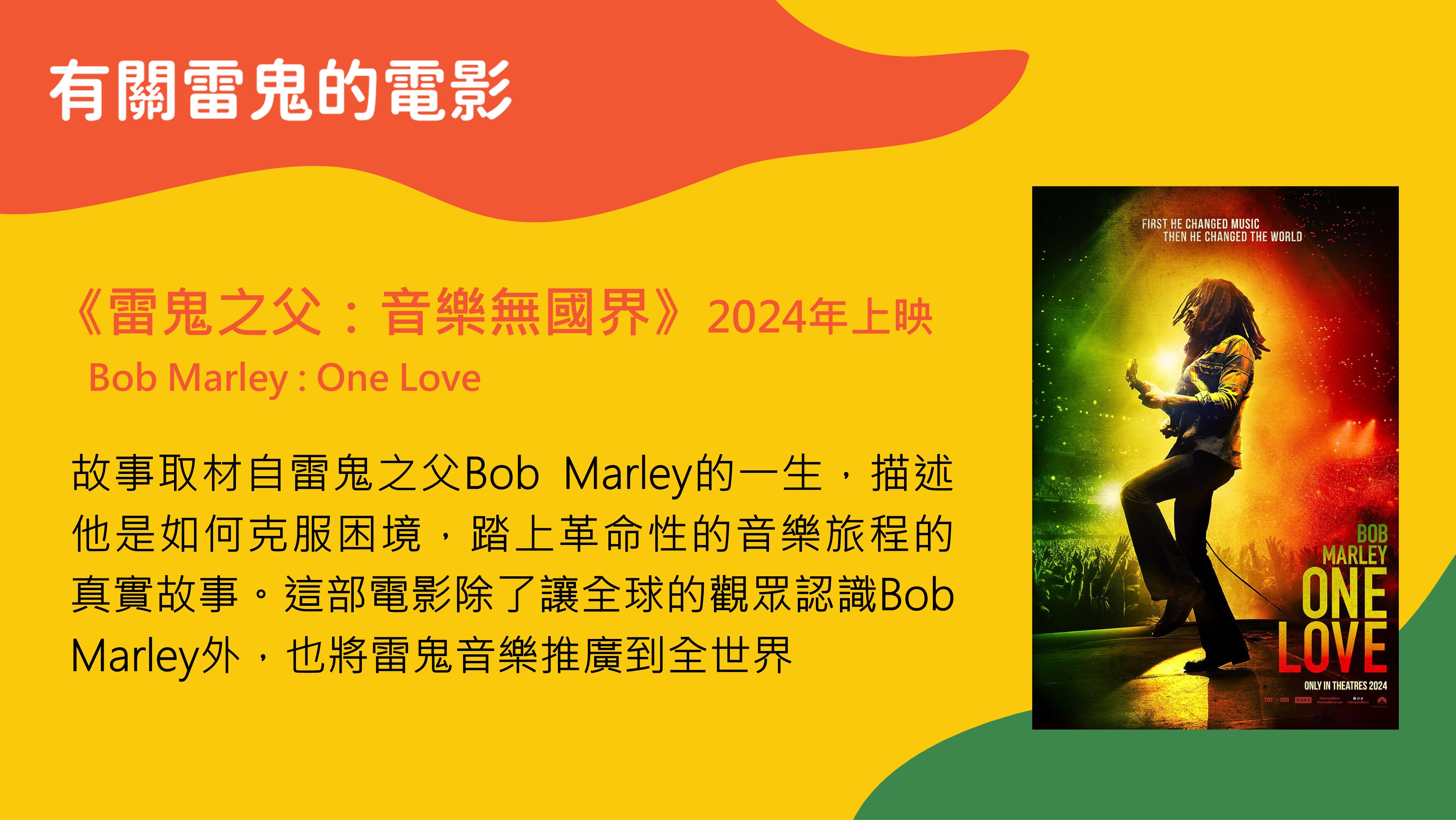 01 雷鬼音樂的誕生與反叛精神02 雷鬼音樂的核心元素與特色 03 牙買加自然地景與雷鬼音樂的融合 04 雷鬼音樂的代表藝人和團體 05 雷鬼音樂對全球的影響 06 學習歷程 |