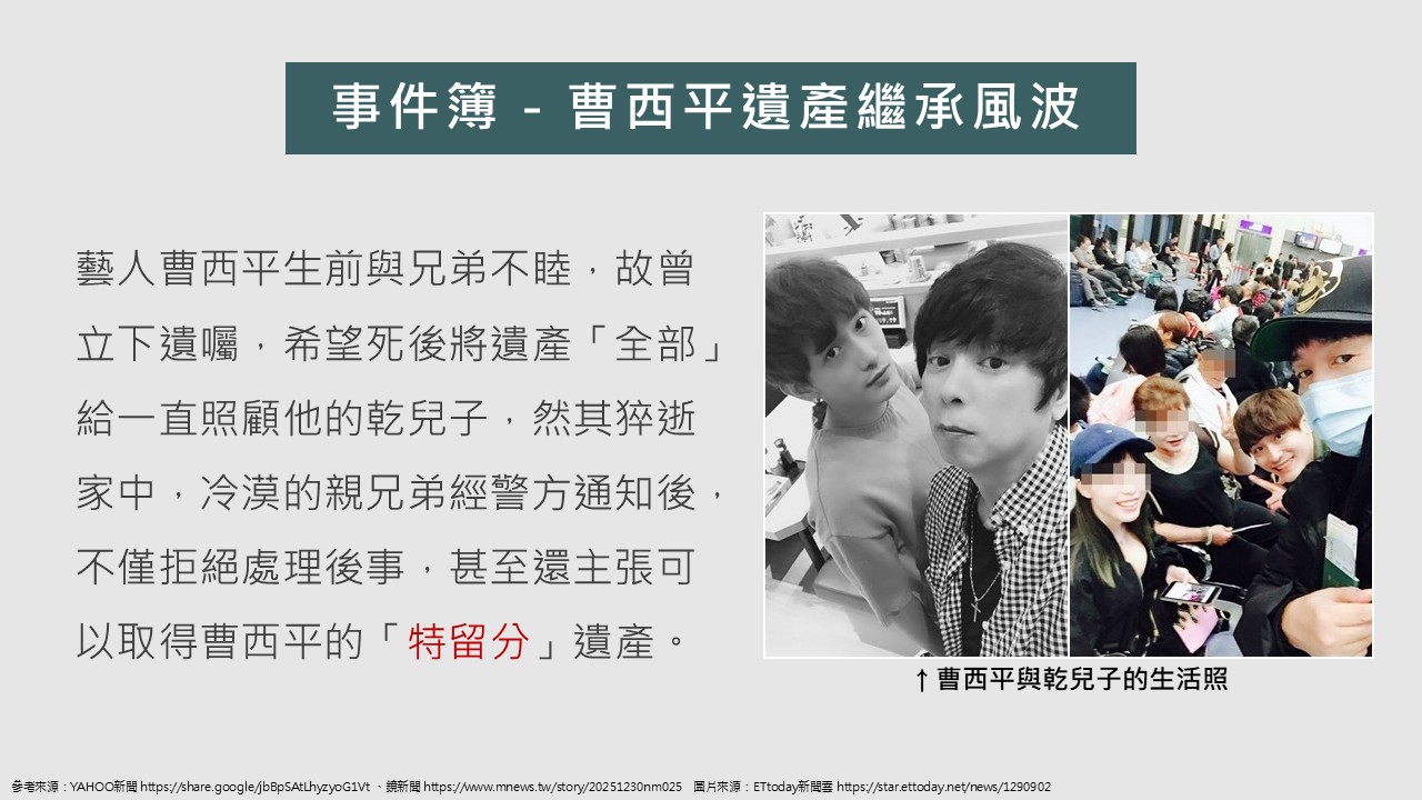 近年臺灣社會逐漸出現「遺產是否一定要分給兄弟姊妹」的公共討論,尤其在名人案例與政策提案的推動下,特留分制度再次成為社會關注焦點。本課程以新聞案例與法律制度為情境,引導學生理解繼承順位、應繼分與特留分等法律概念,並比較不同國家制度設計,進一步思考法律制度如何在個人財產自由與家庭保障之間取得平衡,培養學生的法律素養與公共議題思辨能力。