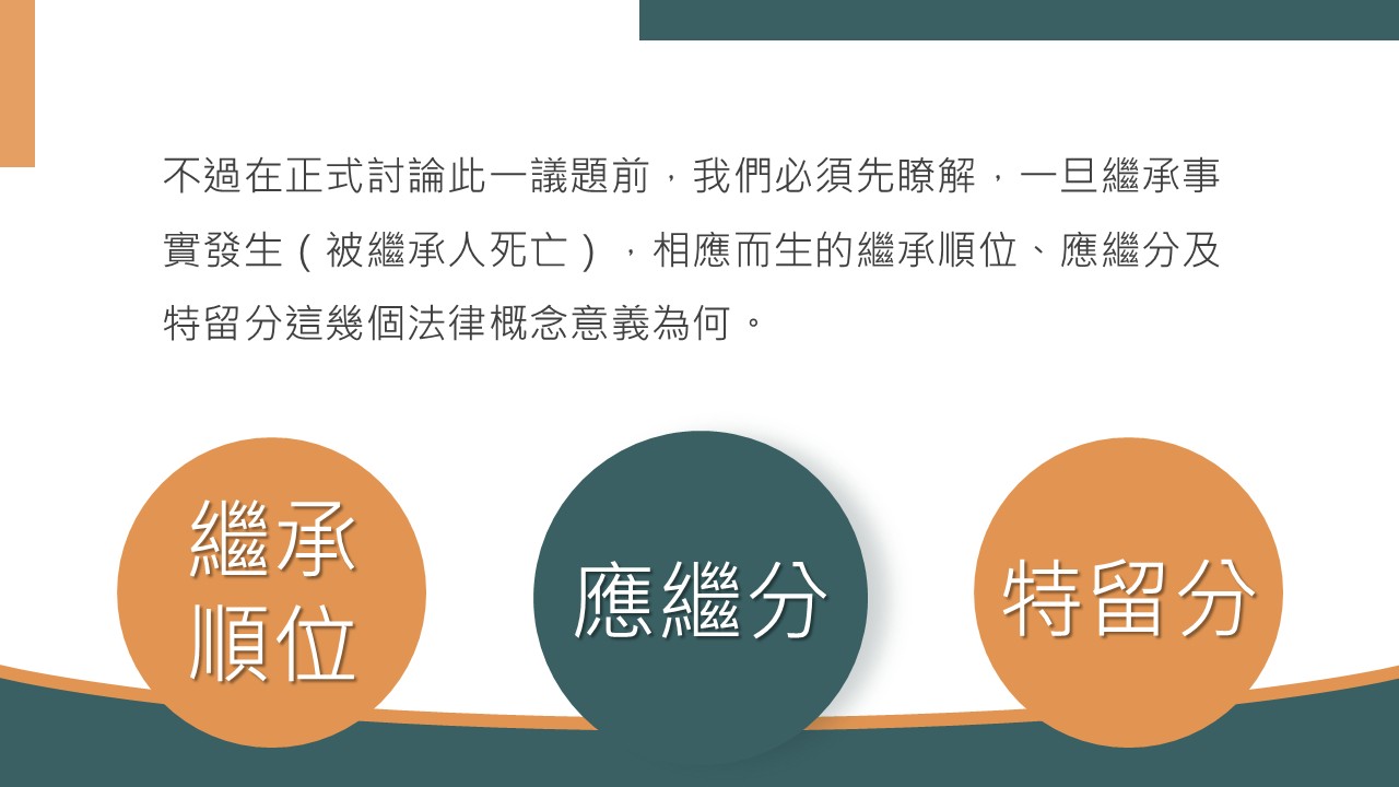 ● 知識層面:認識民法中繼承順位、應繼分與特留分的基本概念,理解特留分制度設計的法律目的與社會背景。
