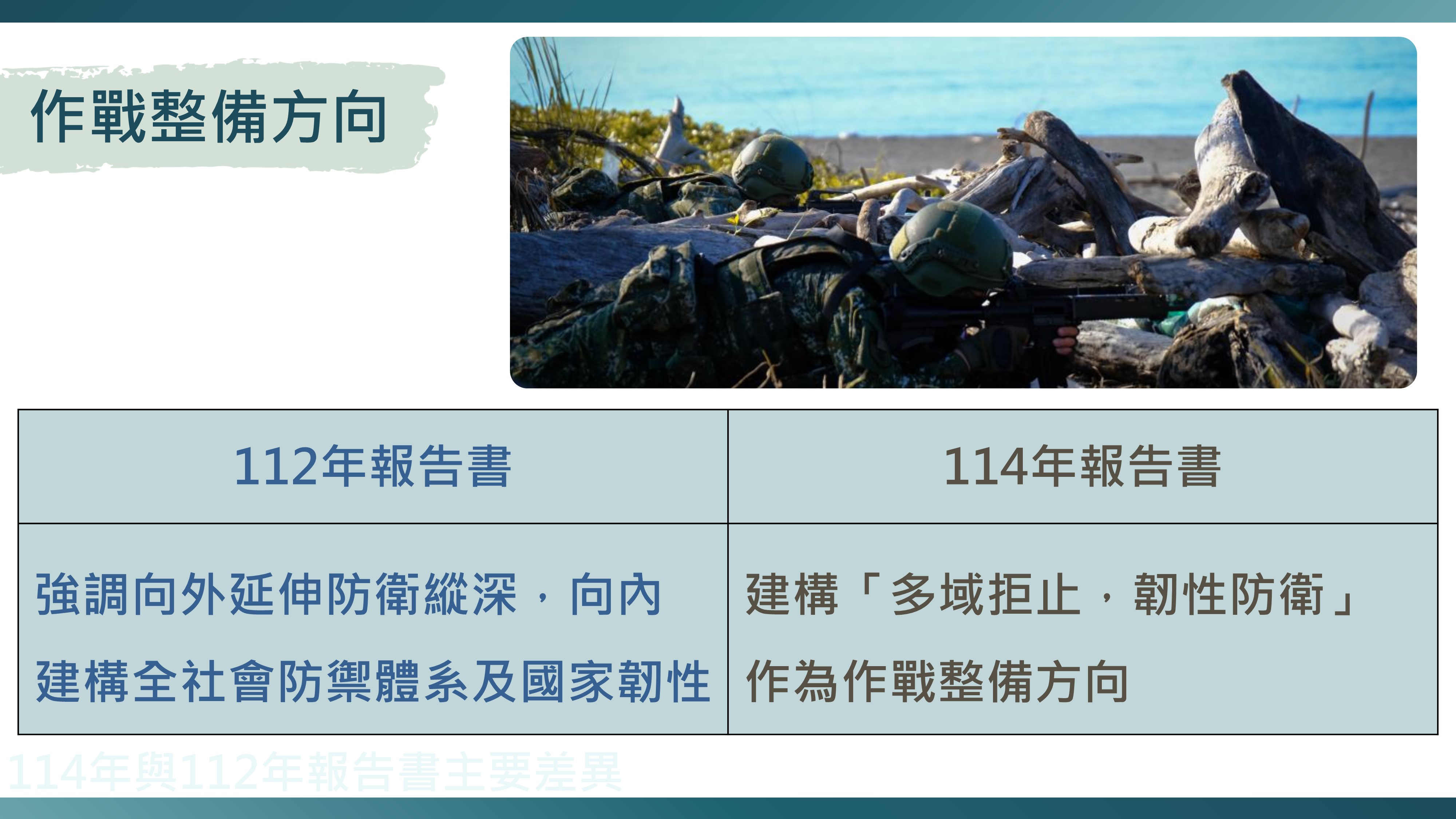 以「敏捷韌性國軍 堅定捍衛國家」為核心,強調國防不只在戰場,更延伸到社會與人民,呈現我國面對威脅時的整體防衛思維。