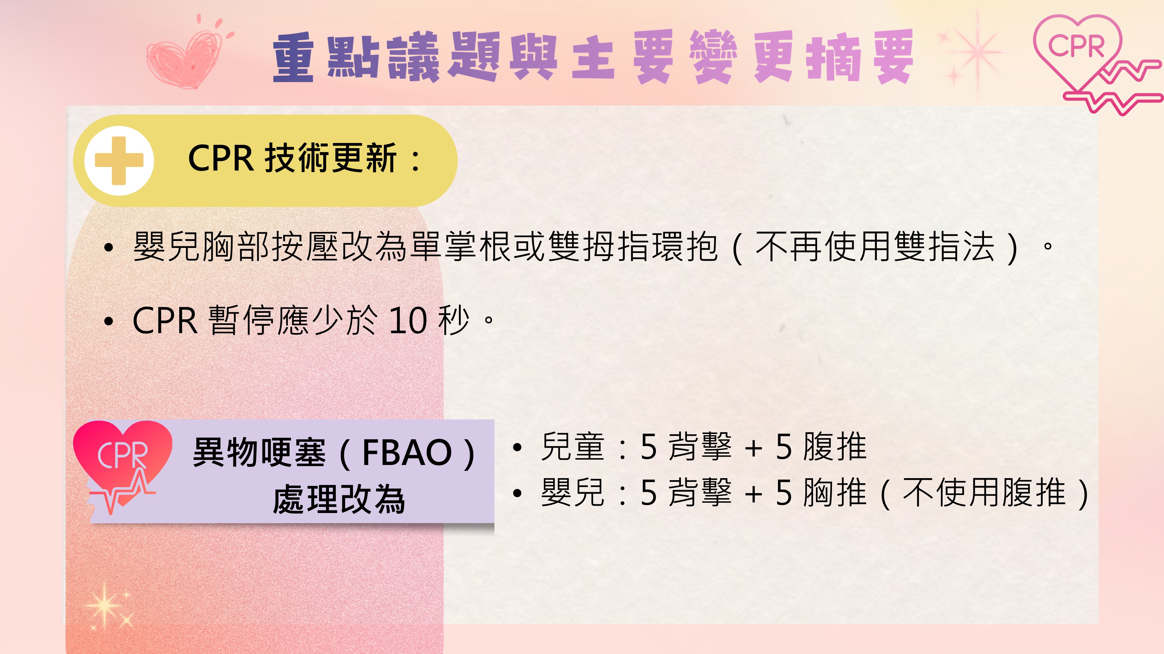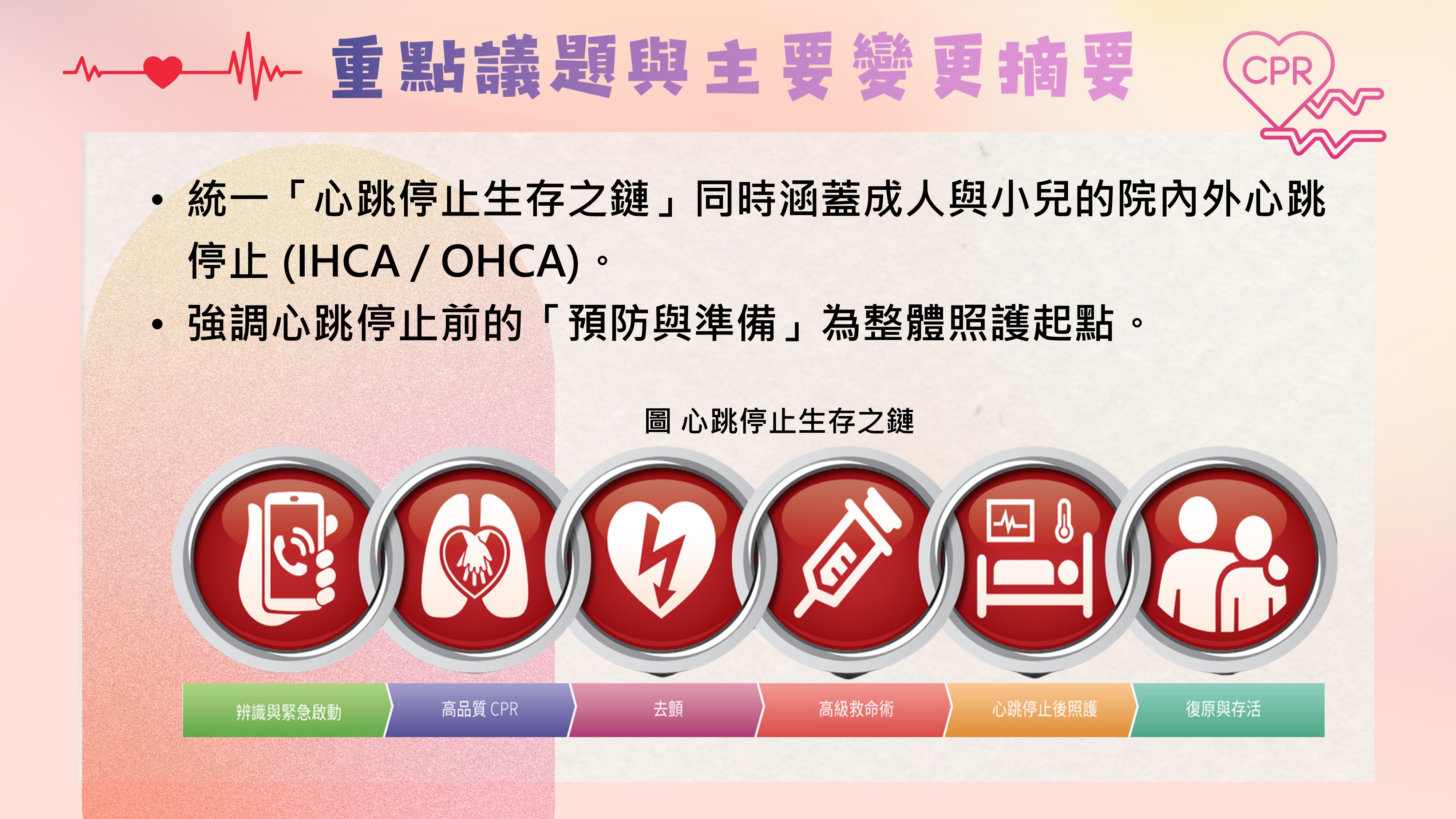 這份簡報以「2025 美國心臟醫學會(AHA)新版 CPR 與 ECC 指引」為核心,完整統整成人、小兒、新生兒救命術的最新更新,涵蓋教育、體系與倫理三大面向。內容突顯 ECPR 、 VR/AR 訓練、社區納洛酮推廣、延遲臍帶夾閉等最新建議,並以「從預防到康復」為主軸,呈現全人復甦與公共衛生的新趨勢。
