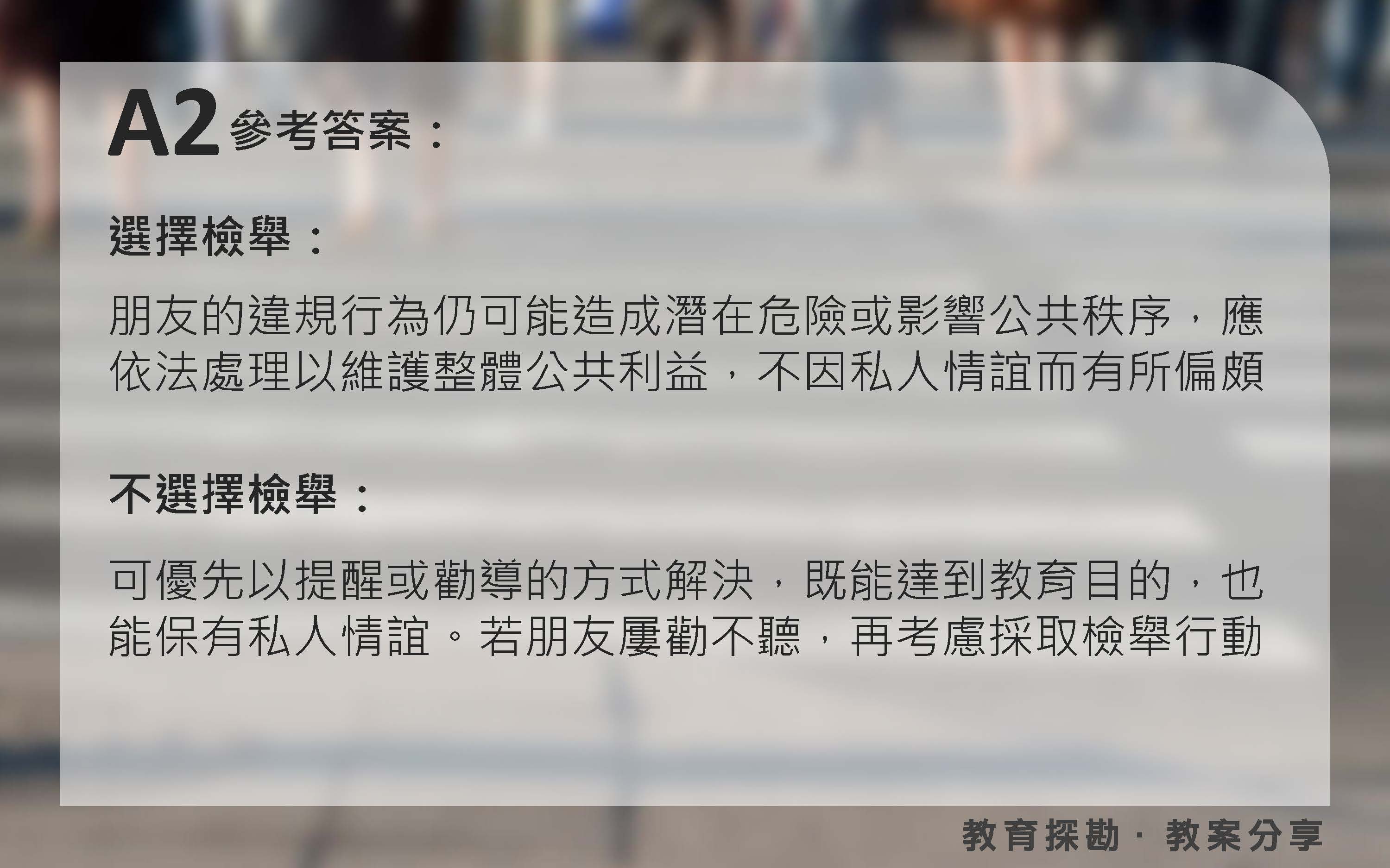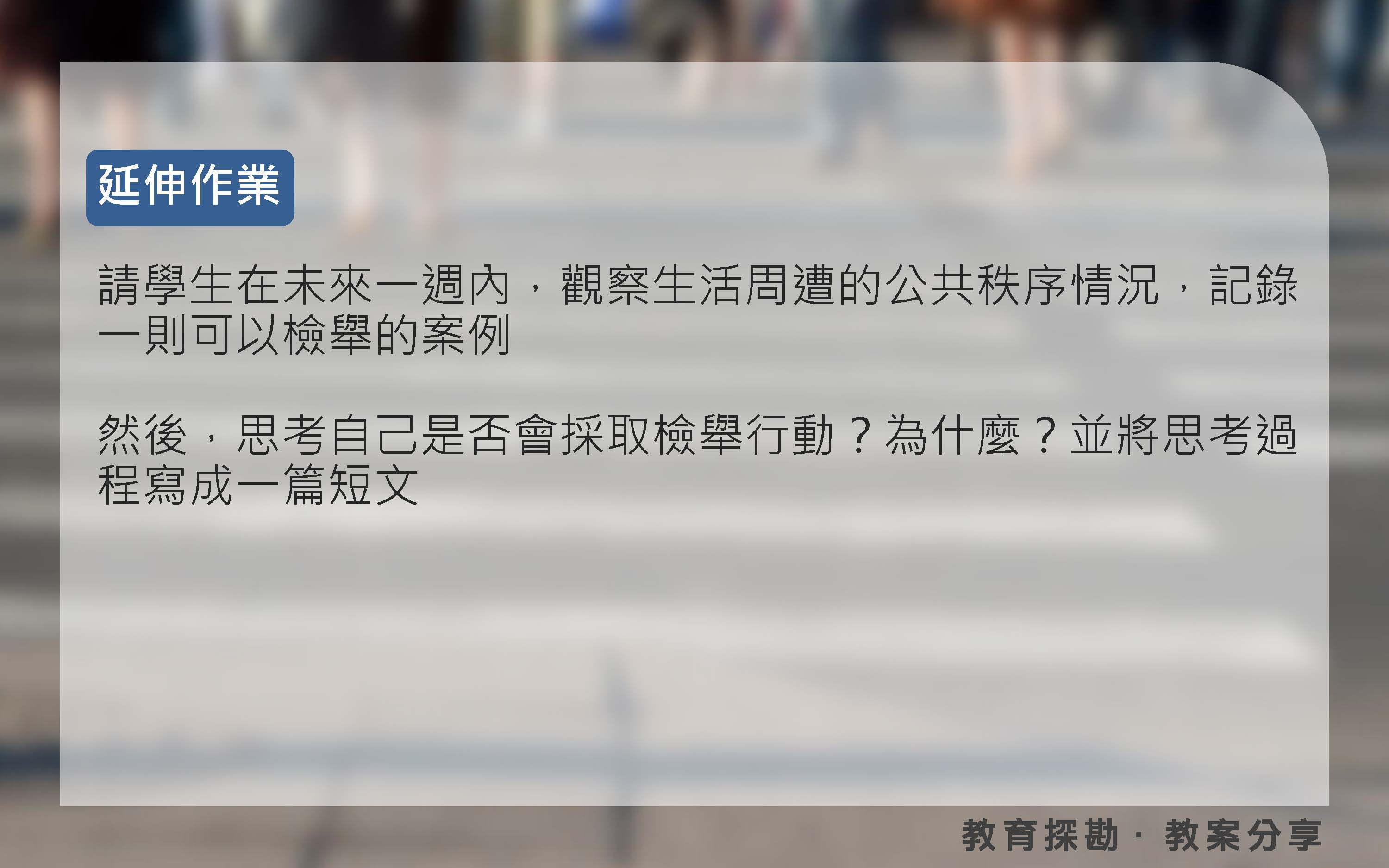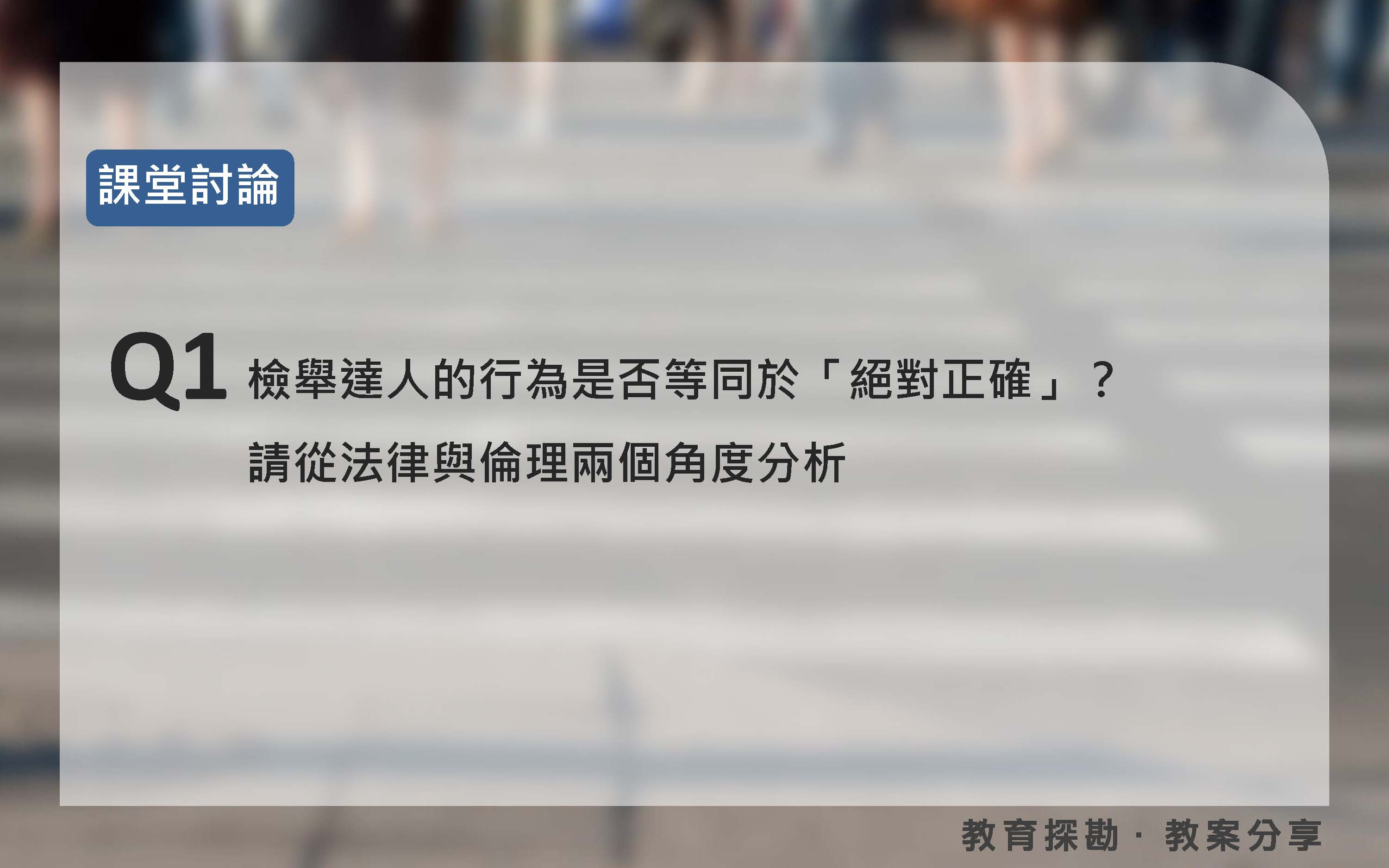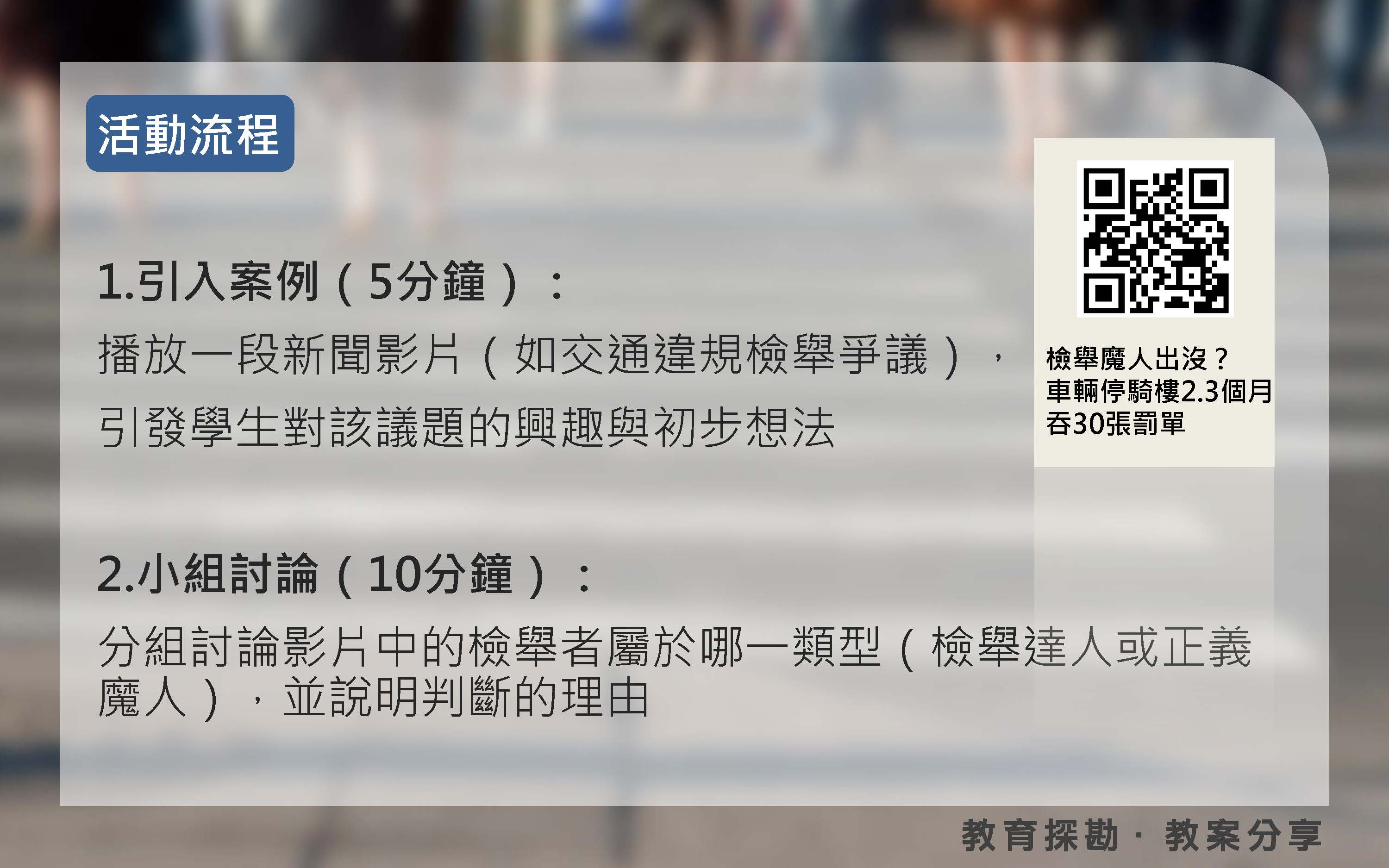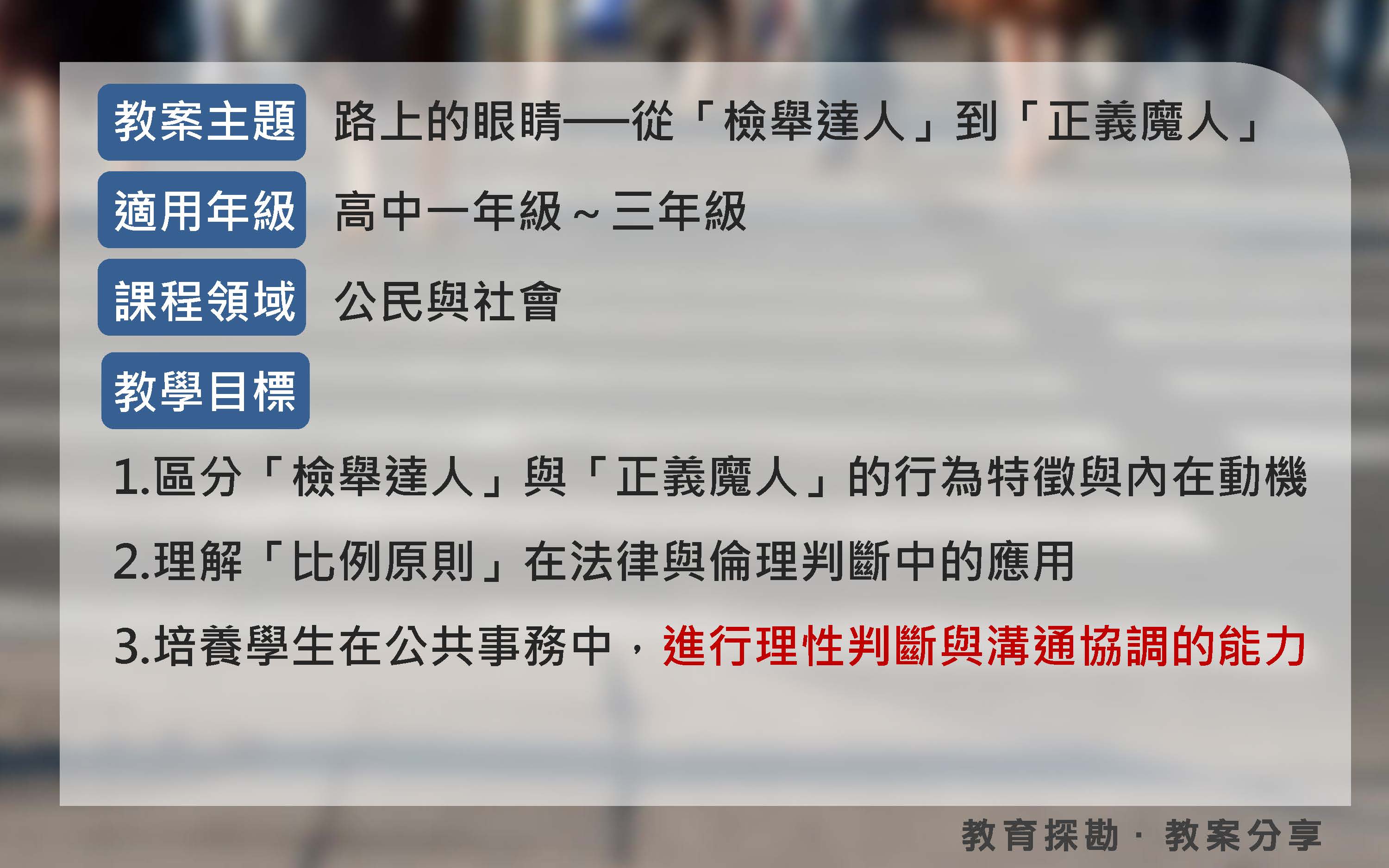 提供《創刊》No.5「教育探勘」專欄〈路上的眼睛─從「檢舉達人」到「正義魔人」的界線 〉之教案分享;「美妙人生」專欄〈低頭族出車禍,責任該算誰的?走路滑手機的危險 真相〉提問之參考答案。