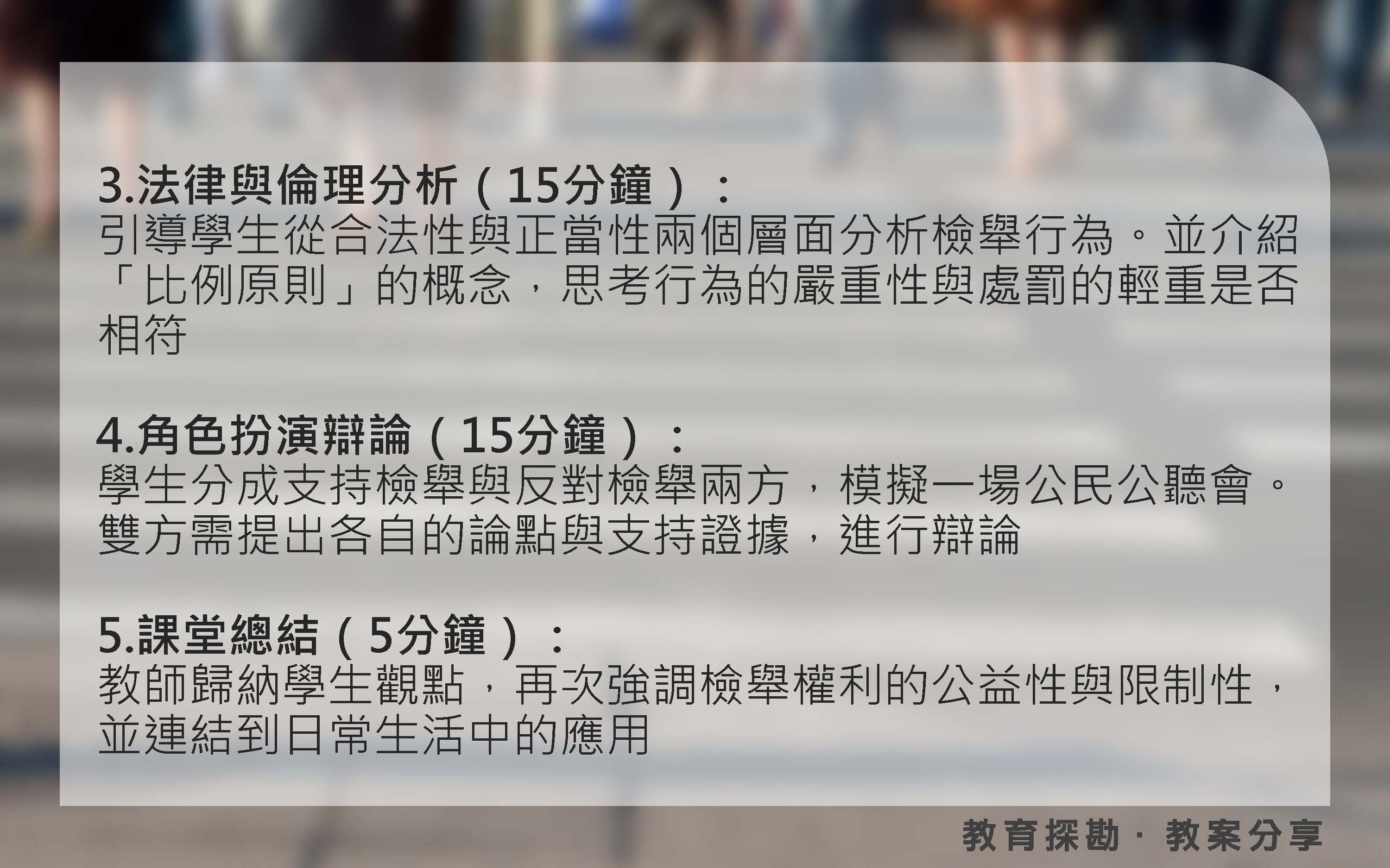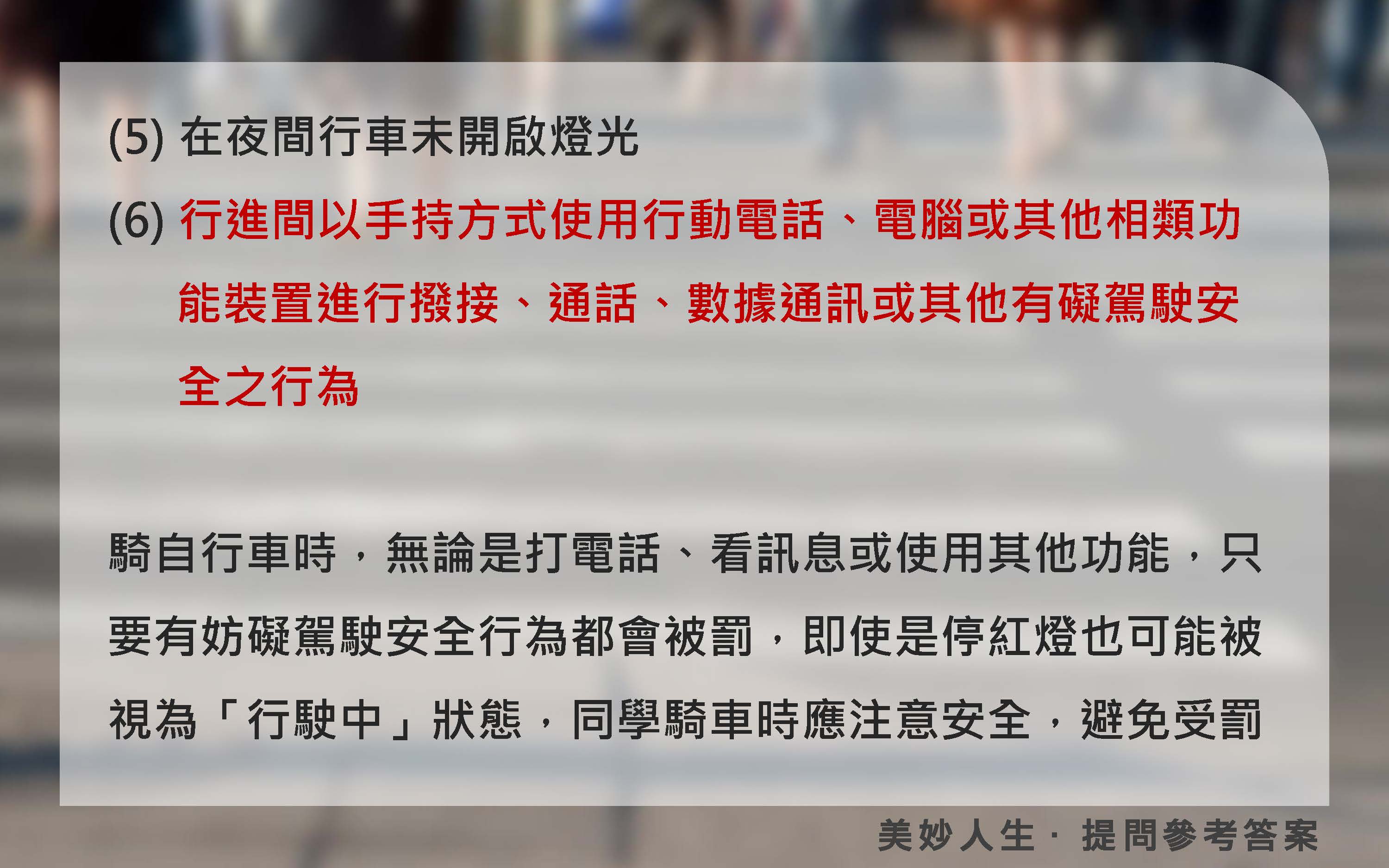學生能認識交通法規與分心用路風險,從法律與倫理角度判斷行為適切性,培養安全意識、理性思考與尊重公共秩序的公民素養。