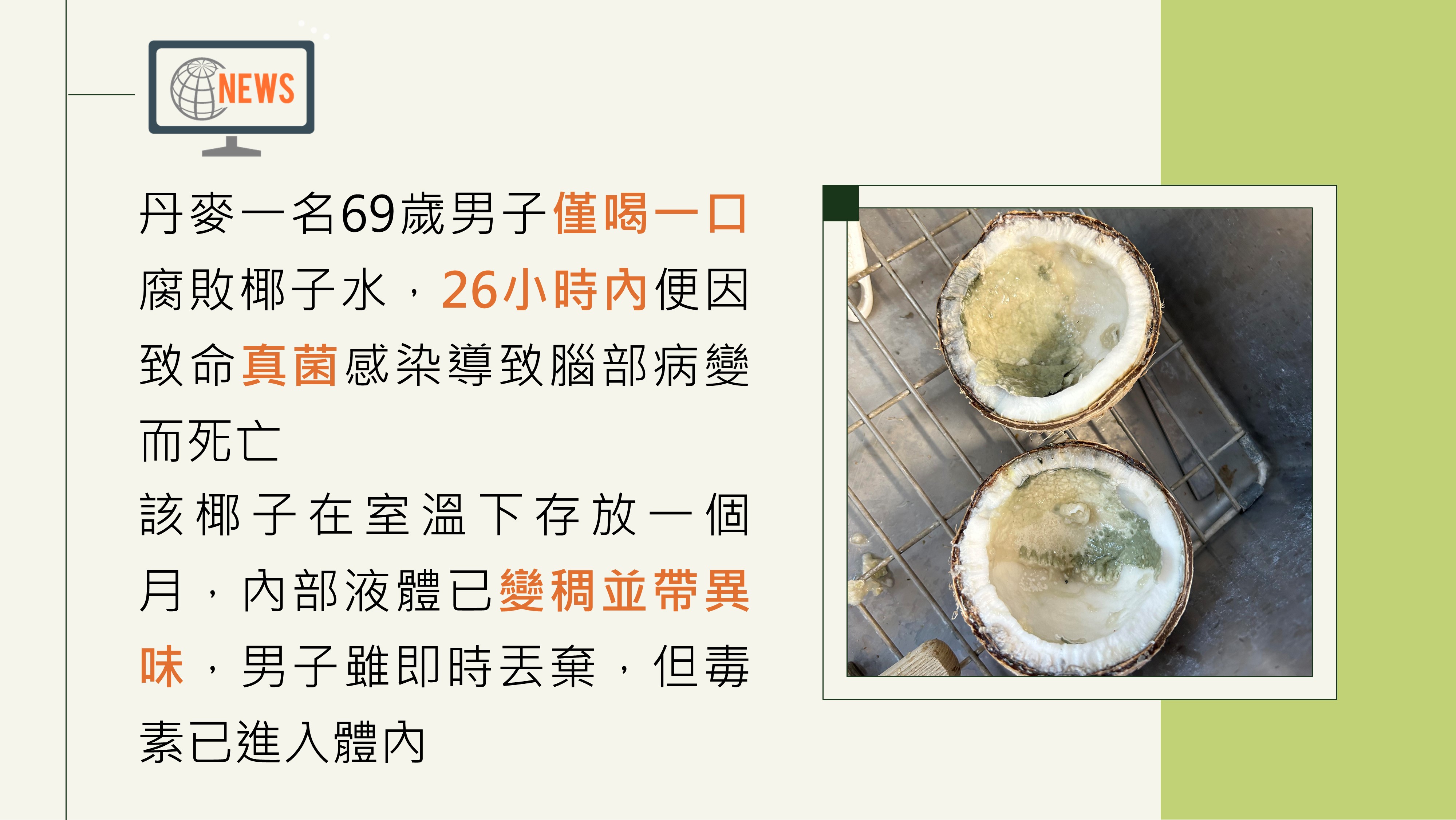 椰子水富含電解質,被稱為「生命之水」,但你知道嗎?一旦保存不當、變質腐敗,竟可能滋生劇毒真菌,奪人性命!本簡報將揭開這起真實案例,帶你認識椰子水的雙面刃,喝得健康也要喝得安全!