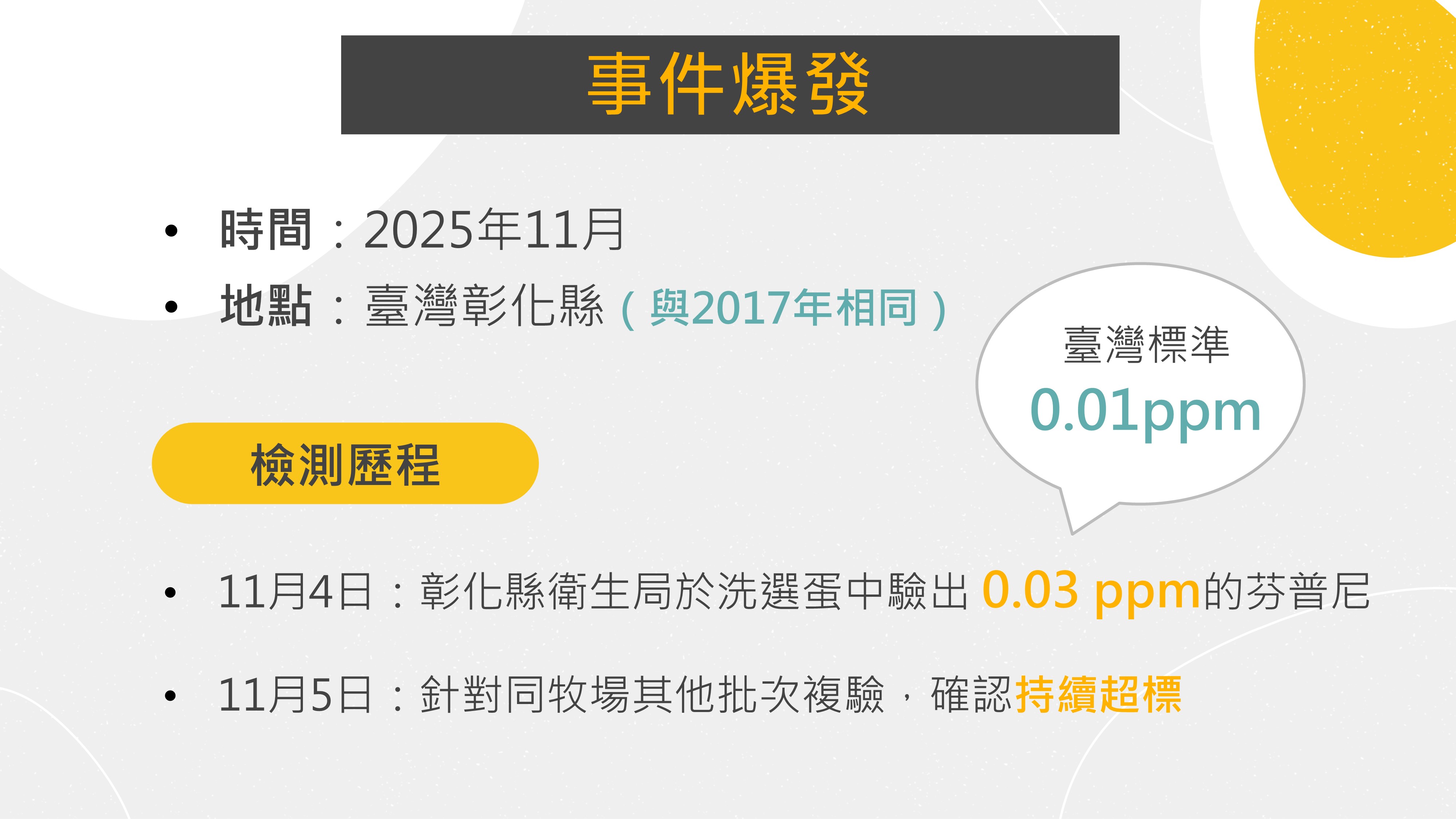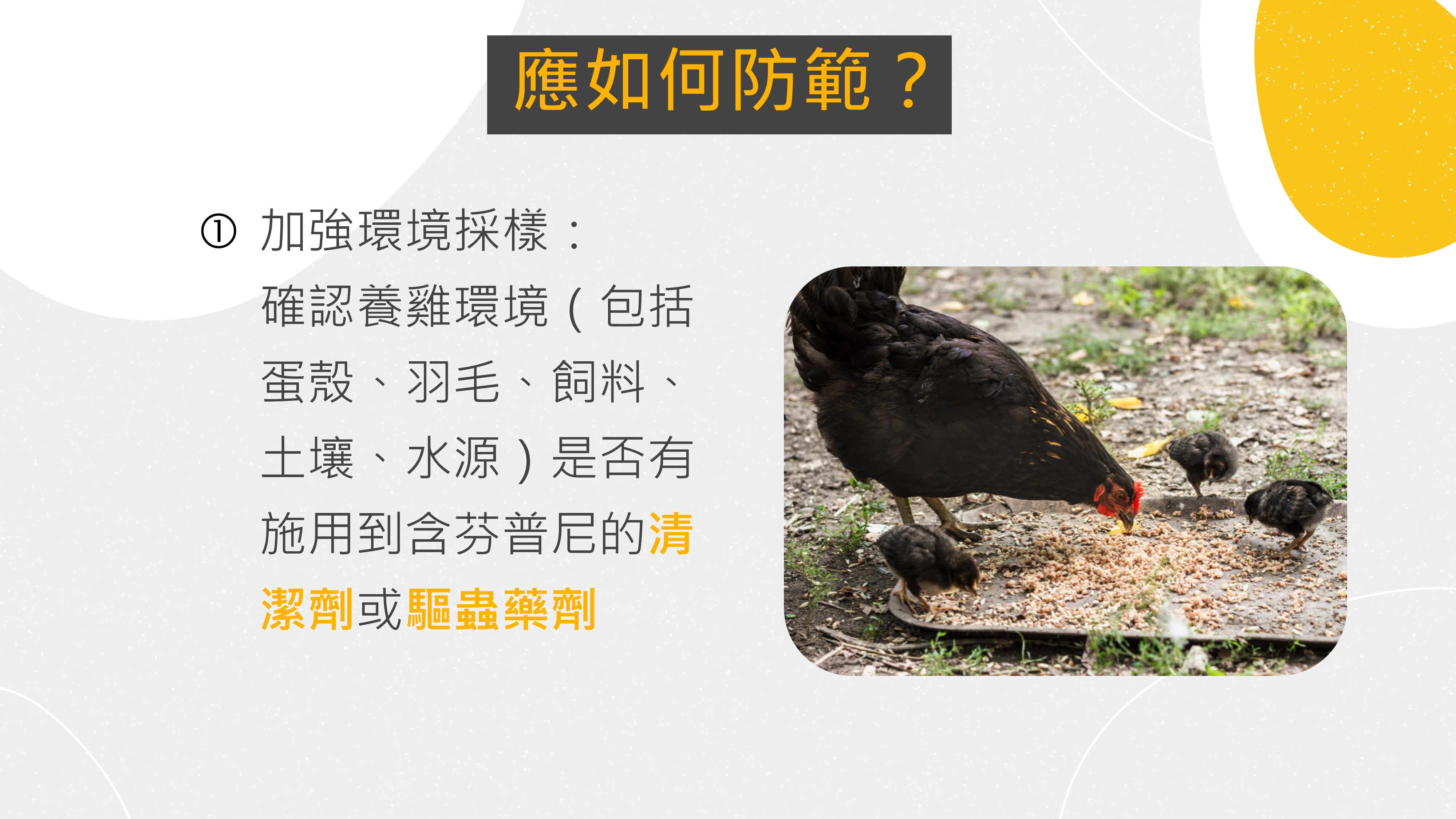 00 芬普尼是什麼?芬普尼對生態的危害?01 歐洲毒雞蛋事件 02 臺灣毒雞蛋事件 03 從毒蛋事件中學到什麼? 04 問題與討論 |