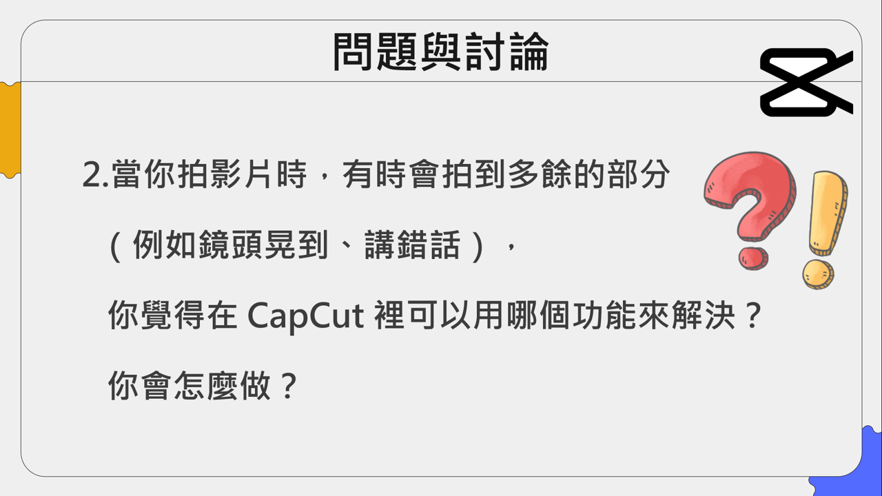 01 認識CapCut02 基礎影片剪輯流程 03 添加元素與特效 04 問題與討論 |