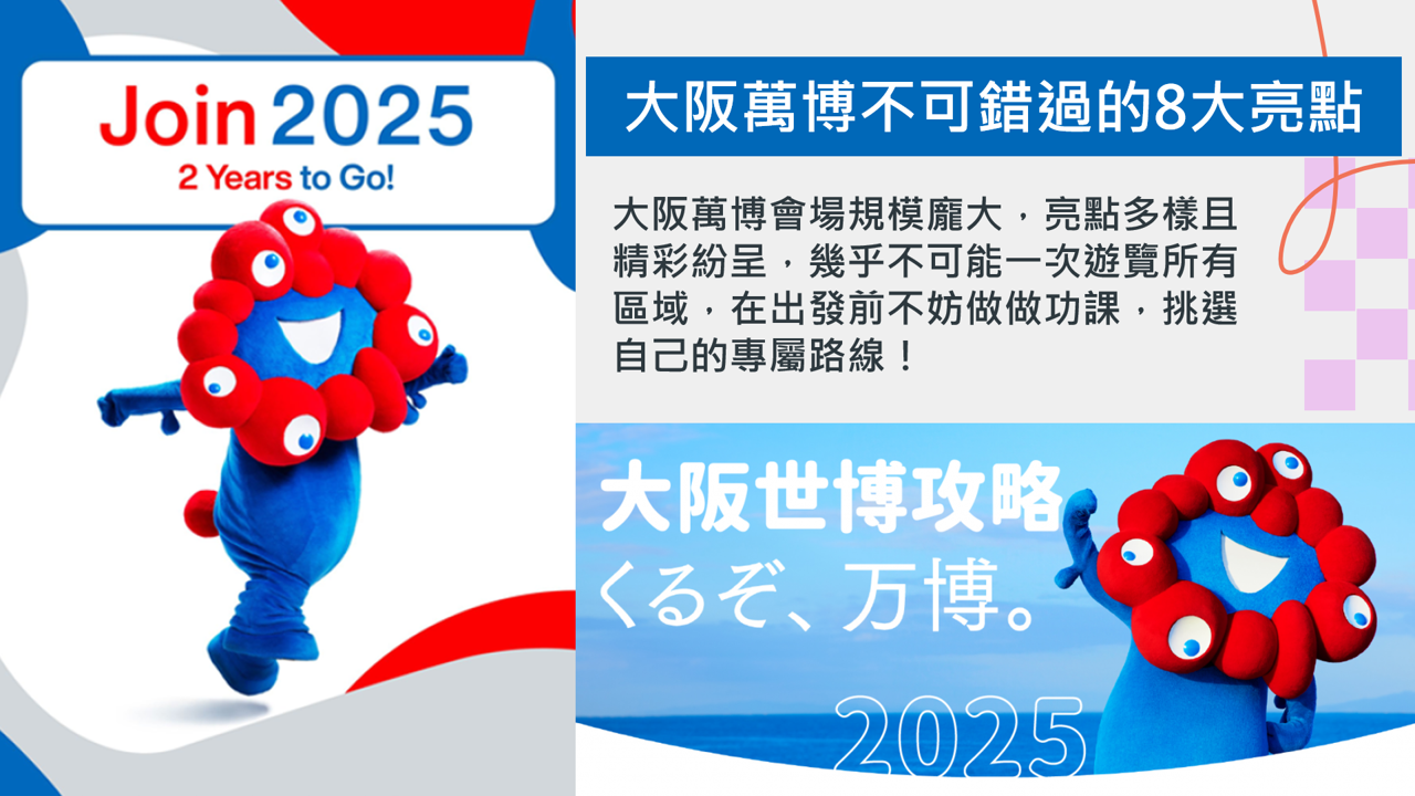 01 世界博覽會02 吉祥物脈脈 03 在大阪萬博能體驗到什麼? 04 大阪萬博不可錯過的8大亮點 05 台灣在2025大阪世博! 06 問題與討論 |