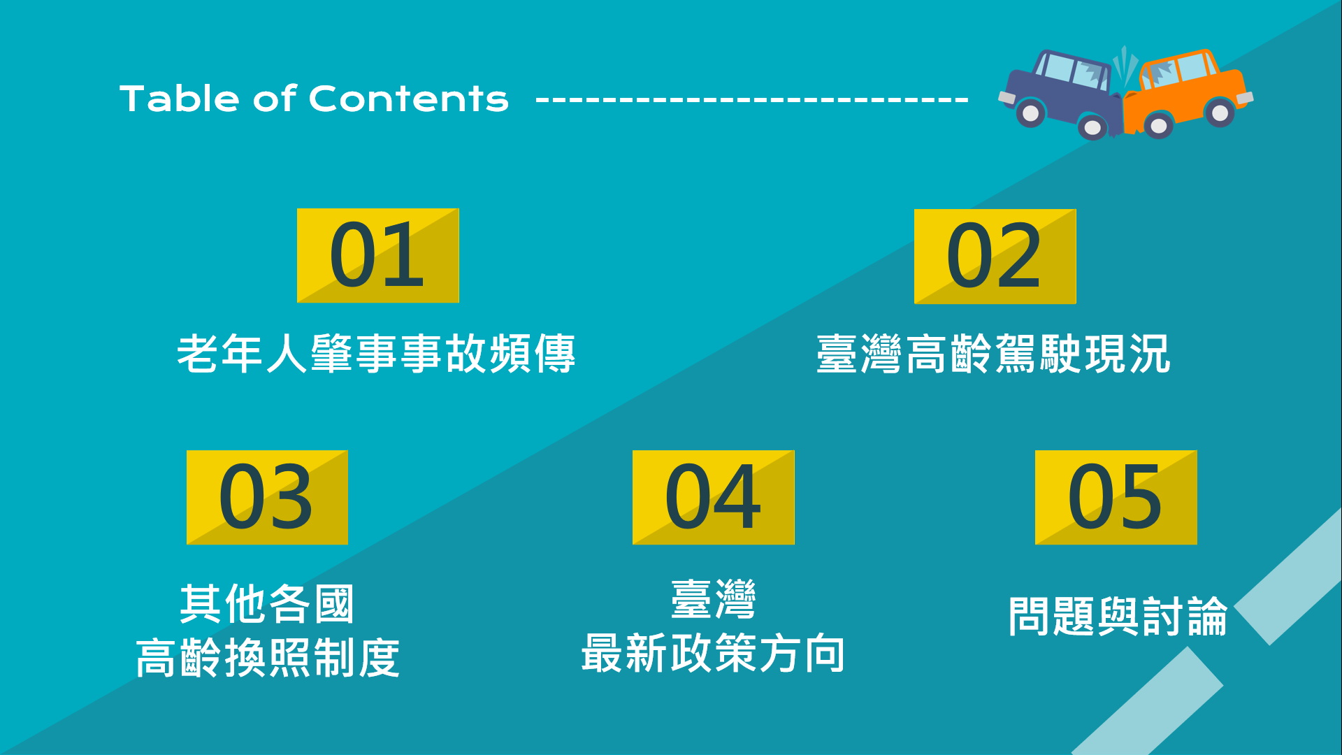 01老年人肇事事故頻傳02臺灣高齡駕駛現況 03其他各國高齡換照制度 04臺灣最新政策方向 05問題與討論 |