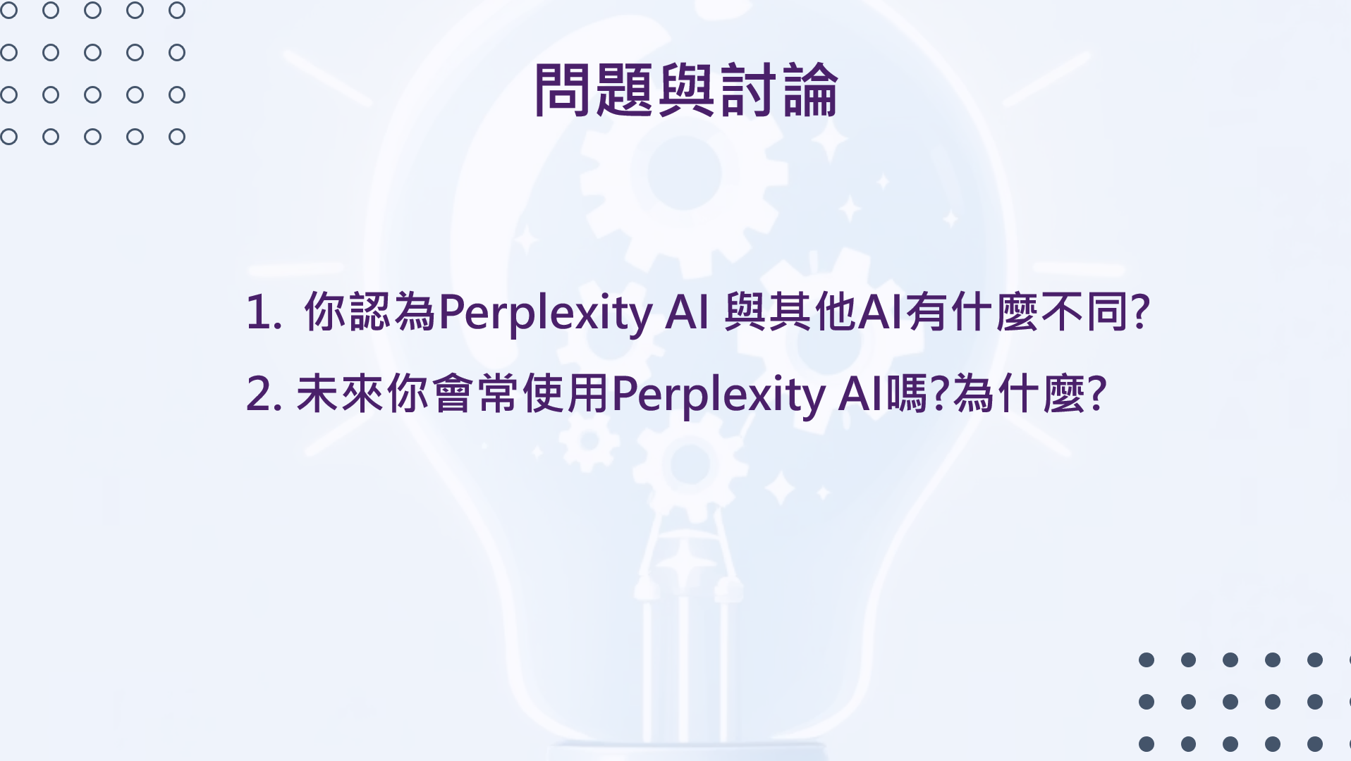 01 設定Perplexity AI 繁體中文介面02 設定Perplexity AI 資料查詢功能 03 使用Perplexity AI Focus Mode 切換資料來源 04 輸入問題與搜尋結果 05 延伸學習、問題討論 |