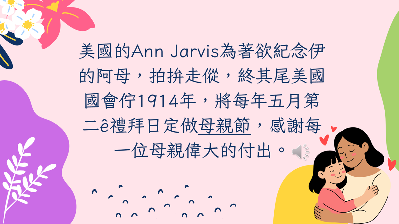學生能了解母親節的由來與意義,認識不同文化中的母親象徵。能正確使用臺語表達母親節相關詞彙,並透過書寫與口語活動表達對母親的感謝,培養語言應用能力與感恩態度。