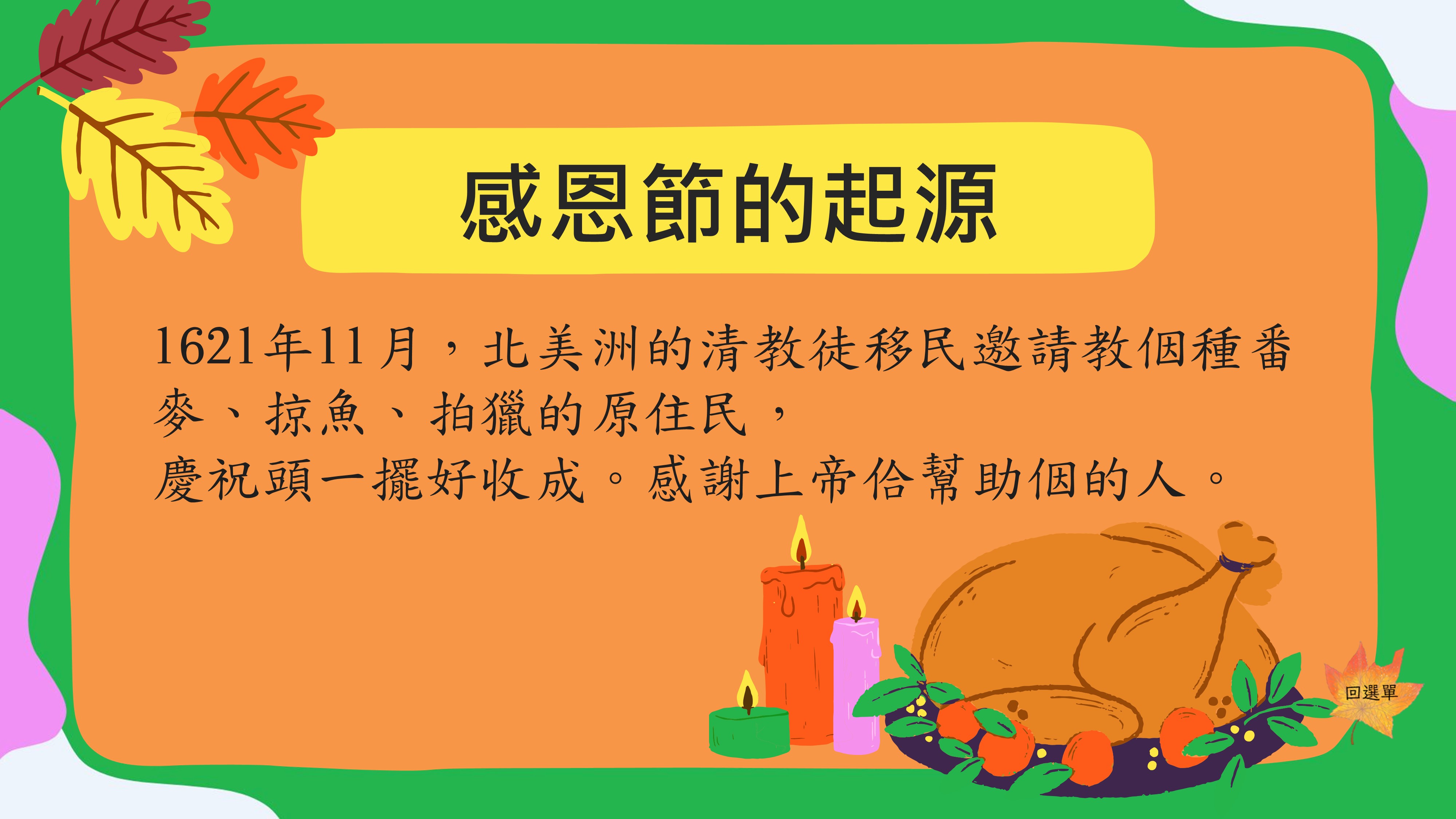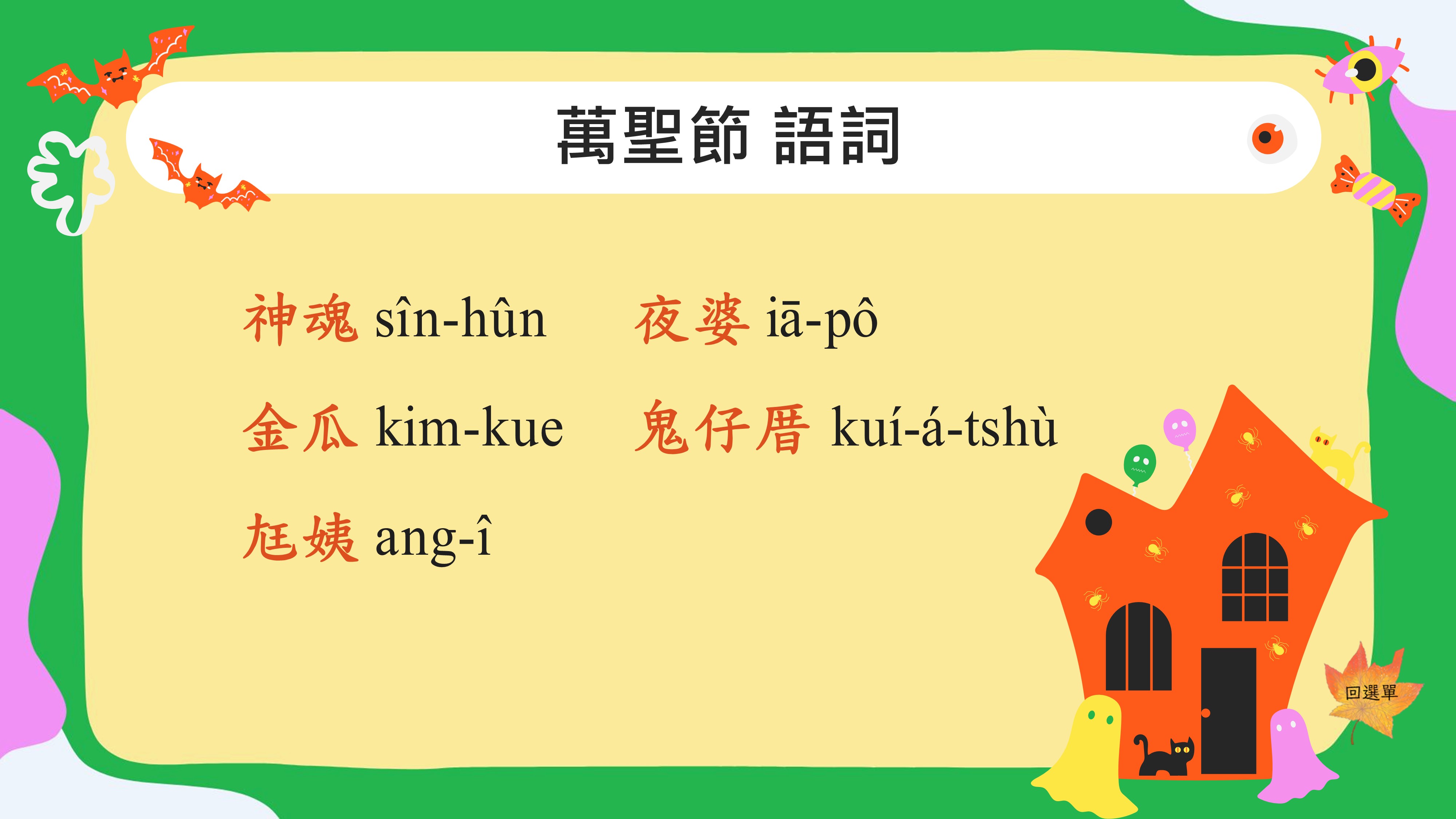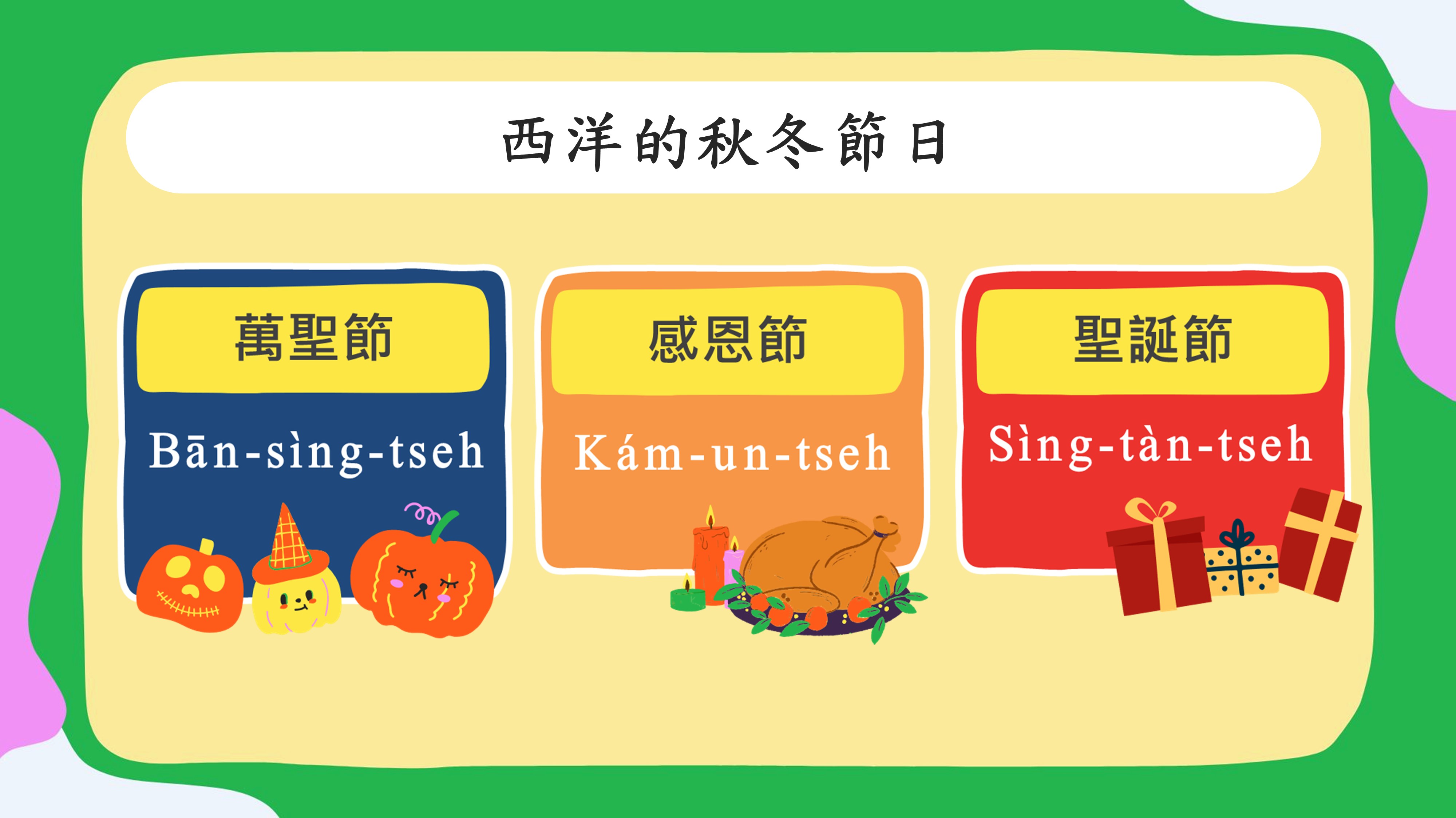 「萬聖節、感恩節、聖誕節」三個西洋節慶為主題,結合文化起源、象徵意涵與閩南語教學