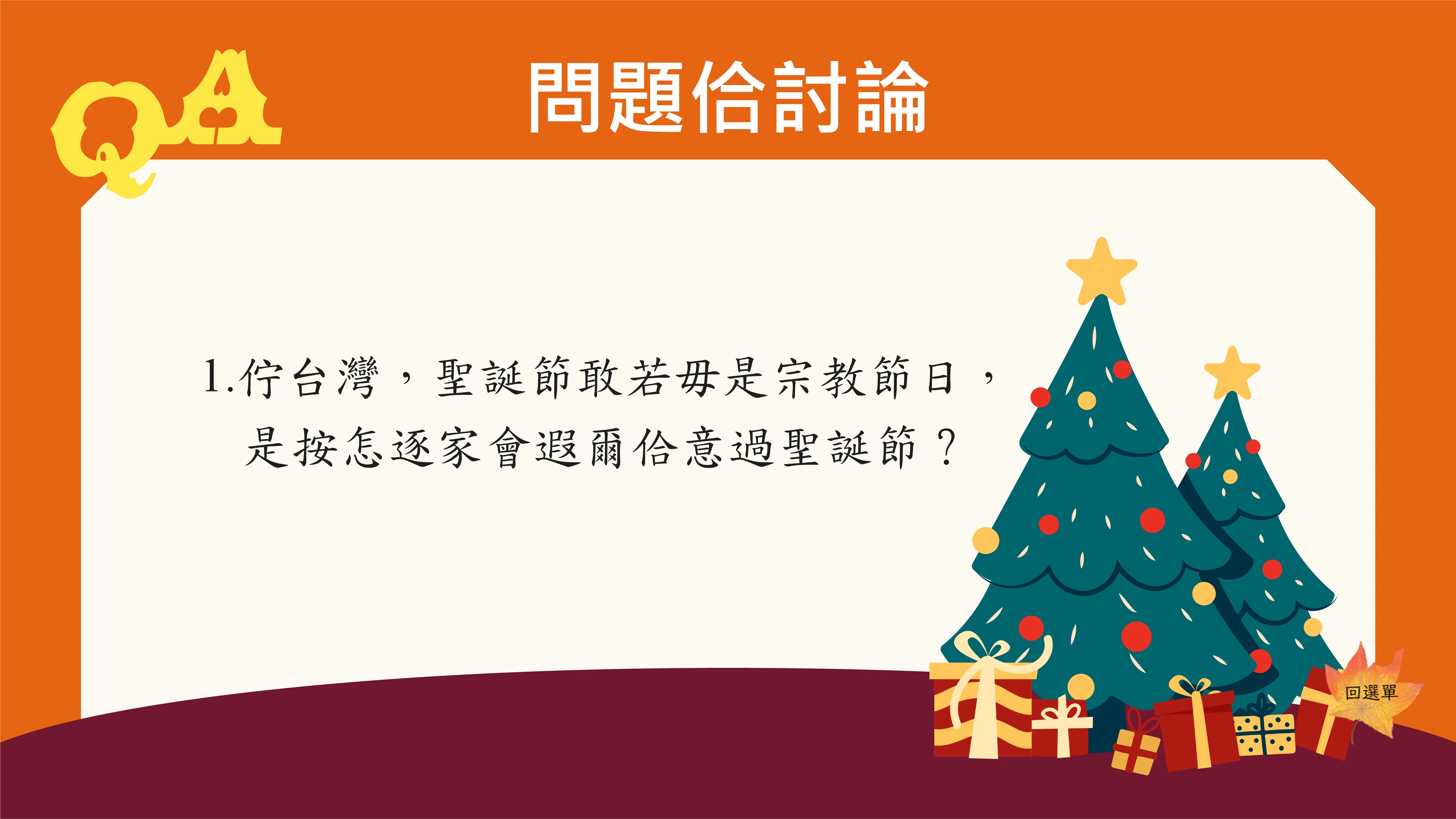 節慶1:萬聖節 Bān-sìng-tseh節慶2:感恩節 Kám-un-tseh 節慶3:聖誕節 Sìng-tàn-tseh |