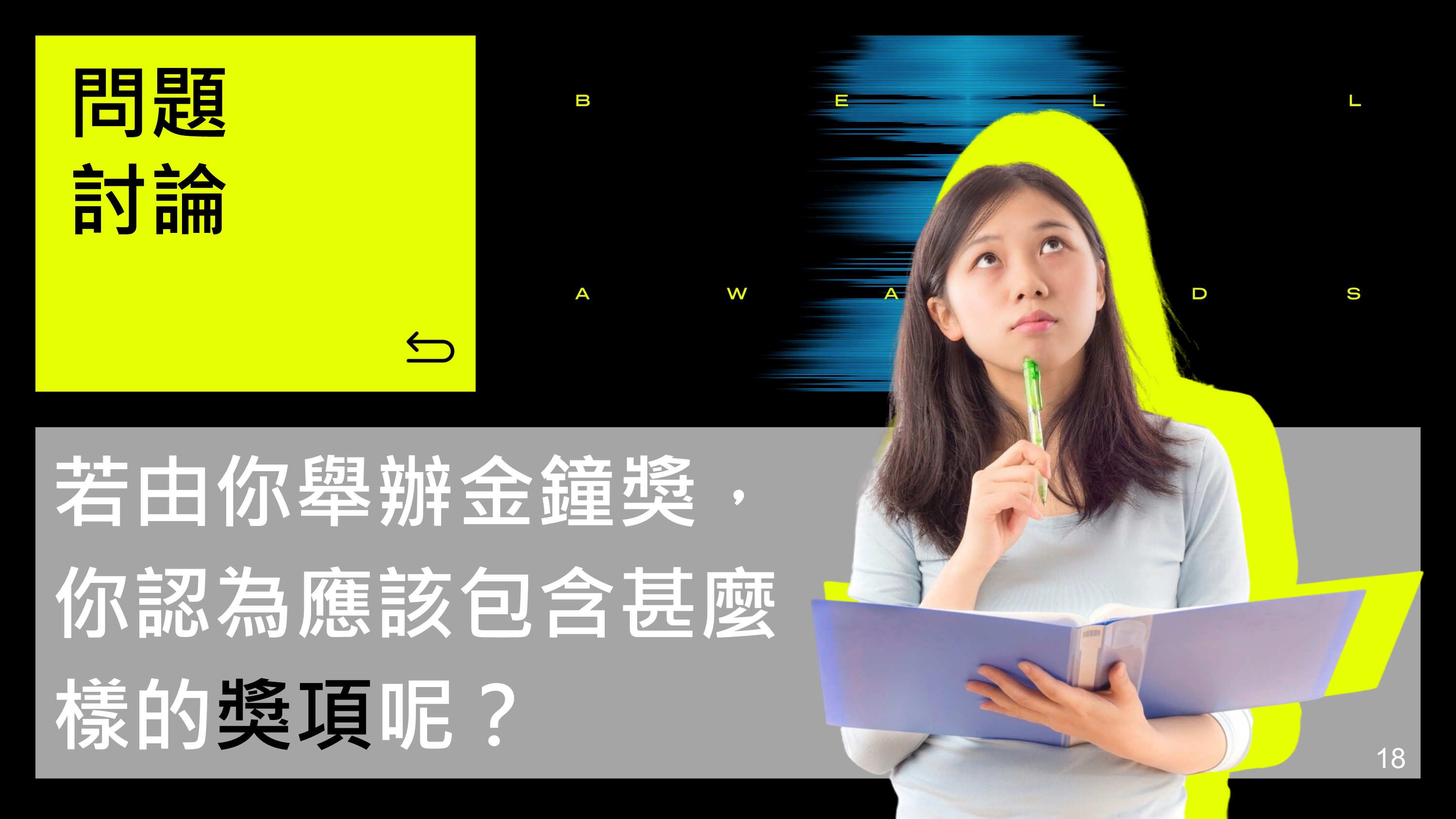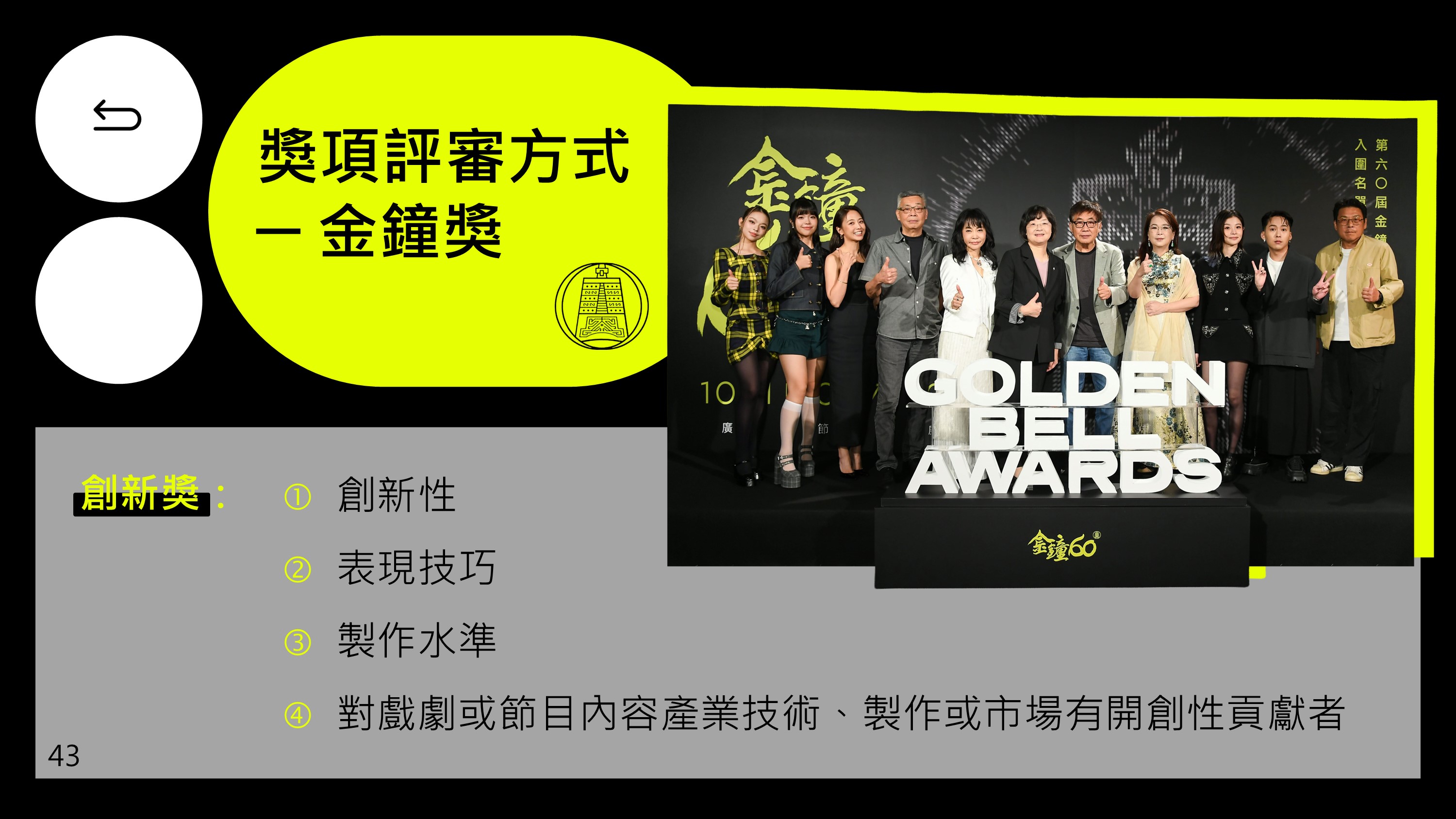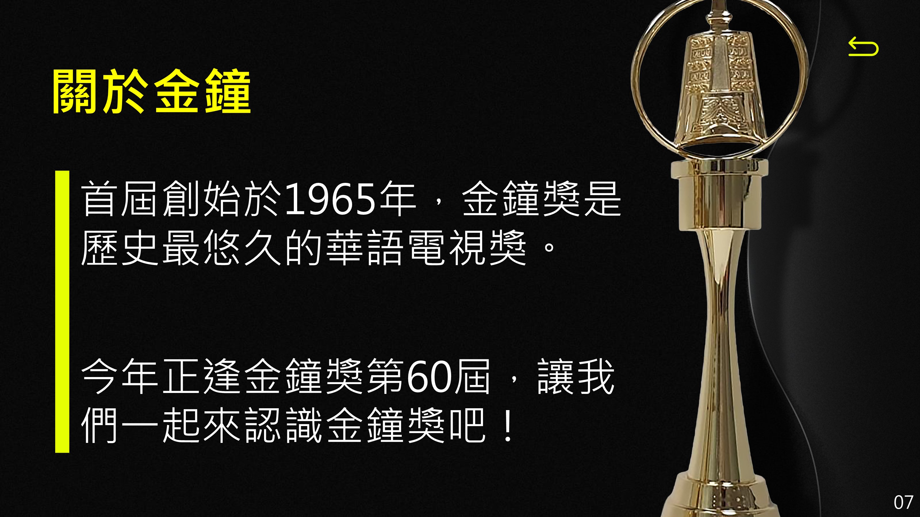 01 關於金鐘02 當鐘聲響起 ─ 那一年,廣播是主角 03 歷史沿革 04 獎項類別與經典時刻 05 獎項評審方式 06 金鐘獎的文化與產業影響力 07 展望與挑戰 08 總結與問答 |