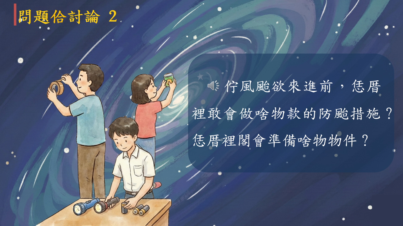 透過風颱生活情境,理解台語詞彙、聲調與漢字結構,培養學生母語覺察力,連結語言、文化與日常經驗,提升學習動機與表達能力。
