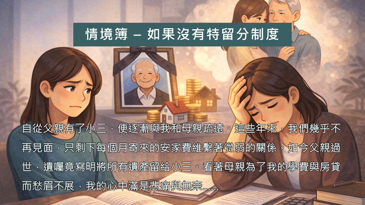 ● 知識層面:認識民法中繼承順位、應繼分與特留分的基本概念,理解特留分制度設計的法律目的與社會背景。