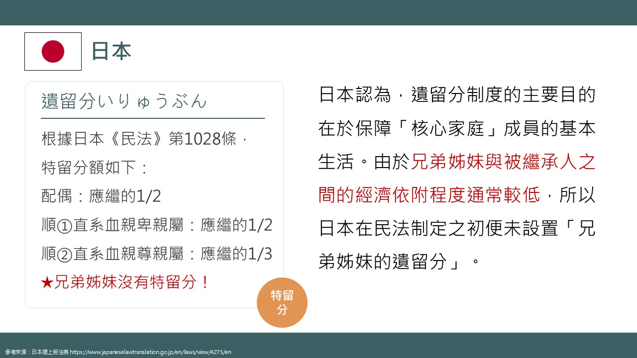 ● 比較教學法:比較臺灣與其他國家的繼承制度差異。