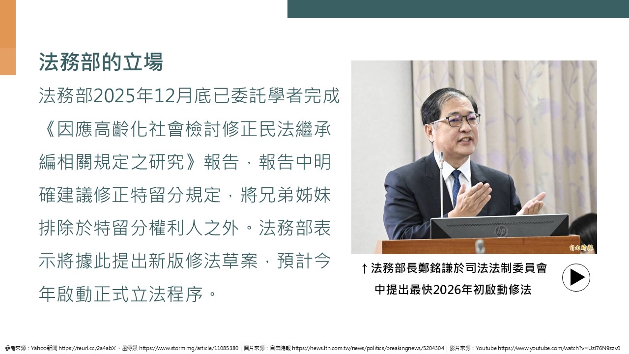 ● 能力層面:能分析新聞案例與法律制度,理解不同國家繼承制度差異,並評估制度改革對社會與家庭關係的影響。